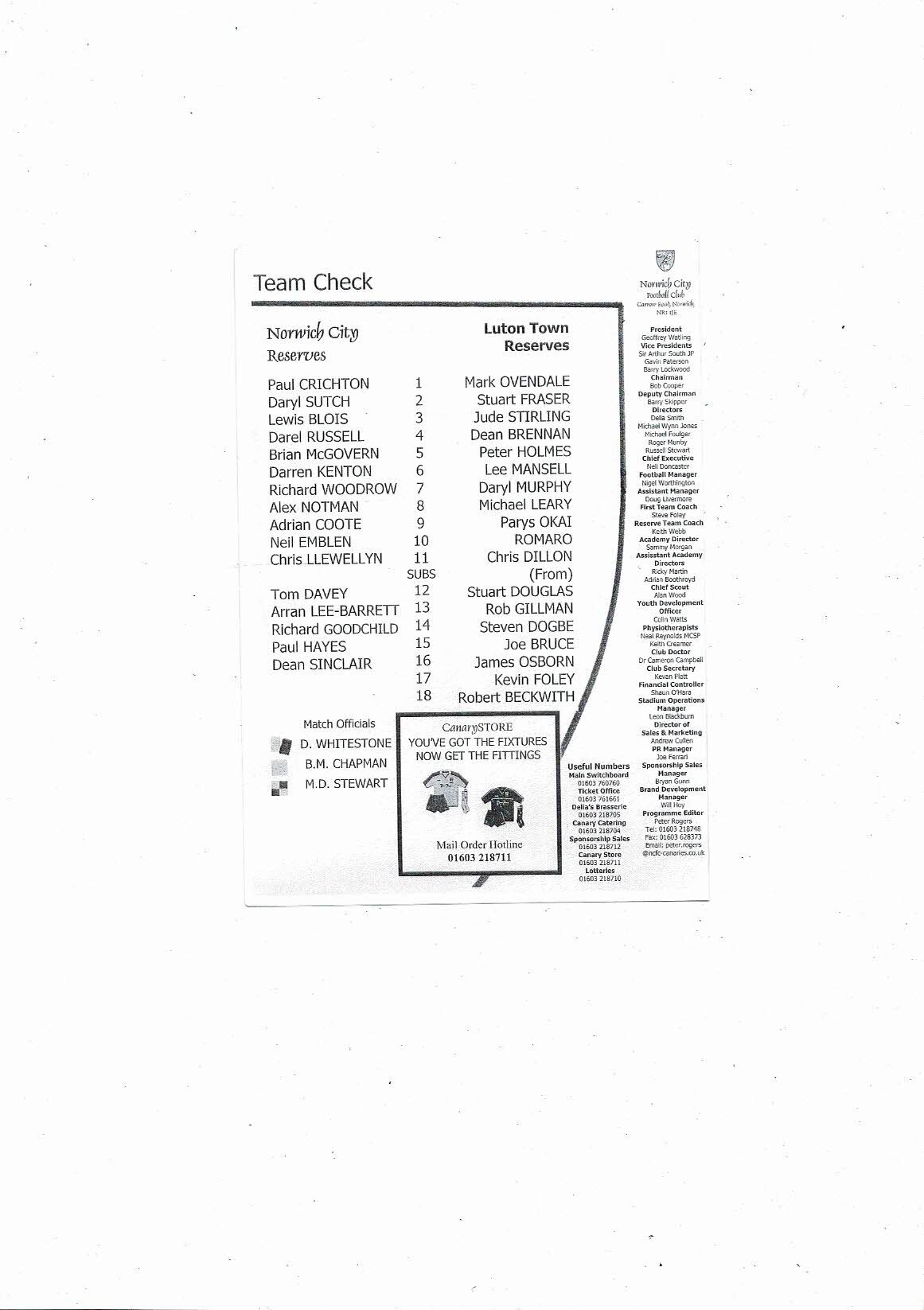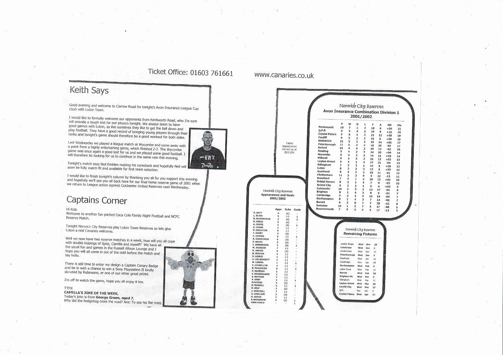 Norwich City v Luton Town Football Combination Programme 2001/02
