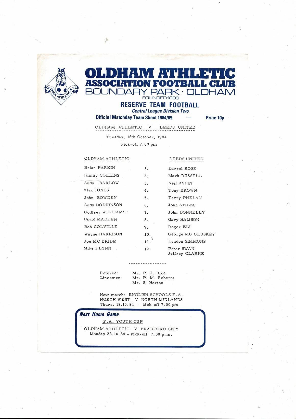 Oldham Athletic v Leeds United Central League Football Programme 1984/85