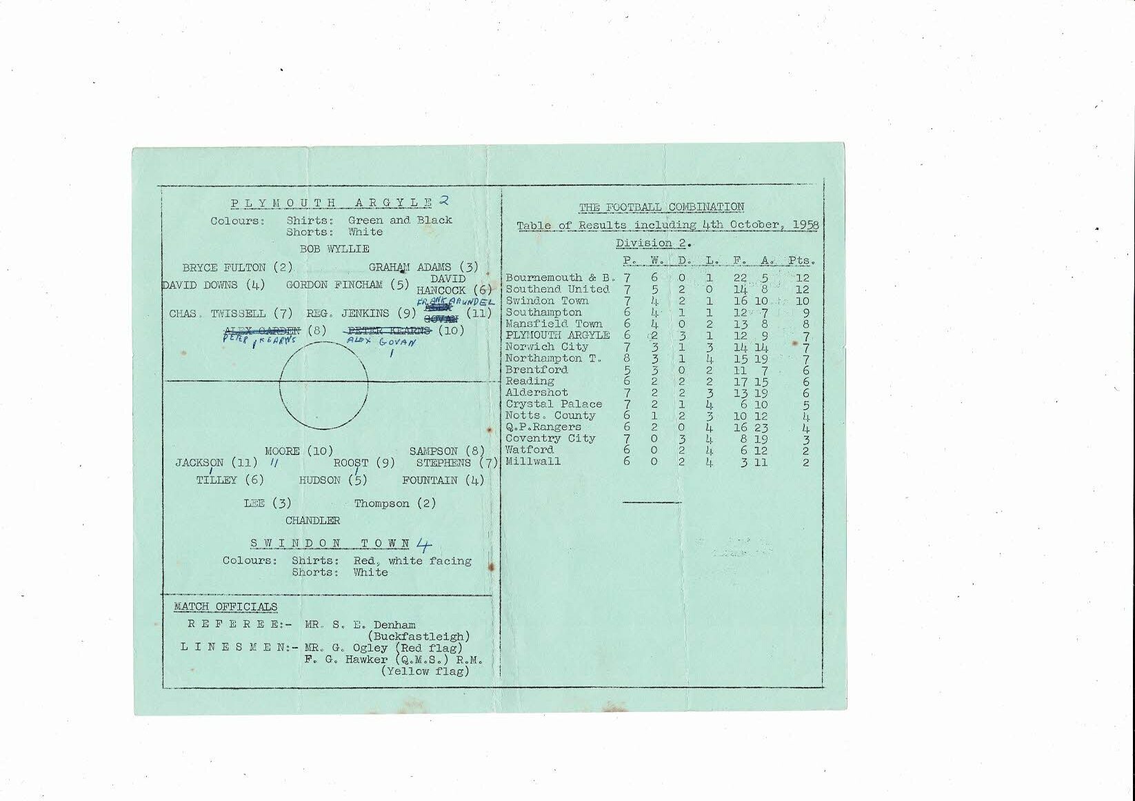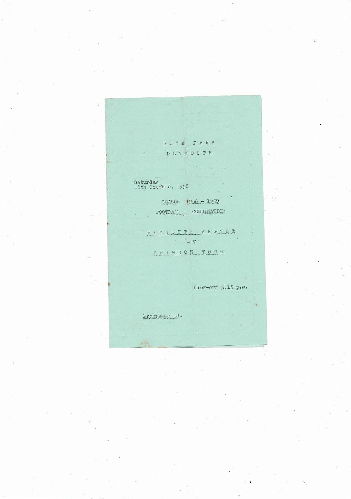 Plymouth Argyle v Swindon Town Football Combination Programme 1958/59