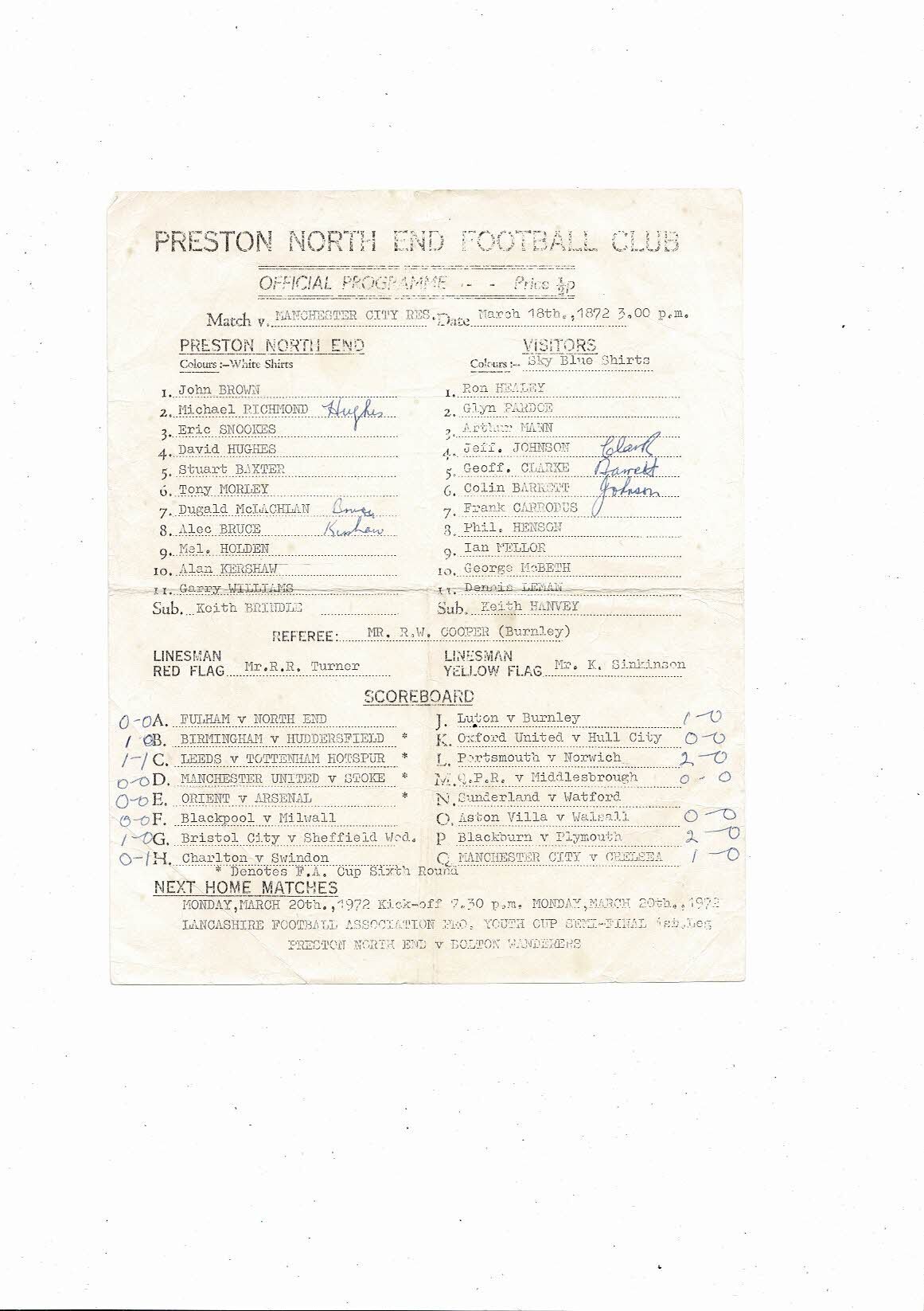 Preston Reserves v Manchester City Reserves Football Programme 1971/72