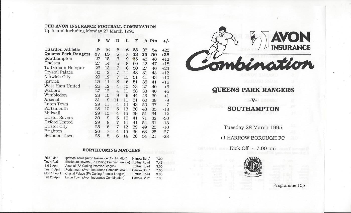 Queens Park Rangers v Southampton Reserves Football Programme 1994/95