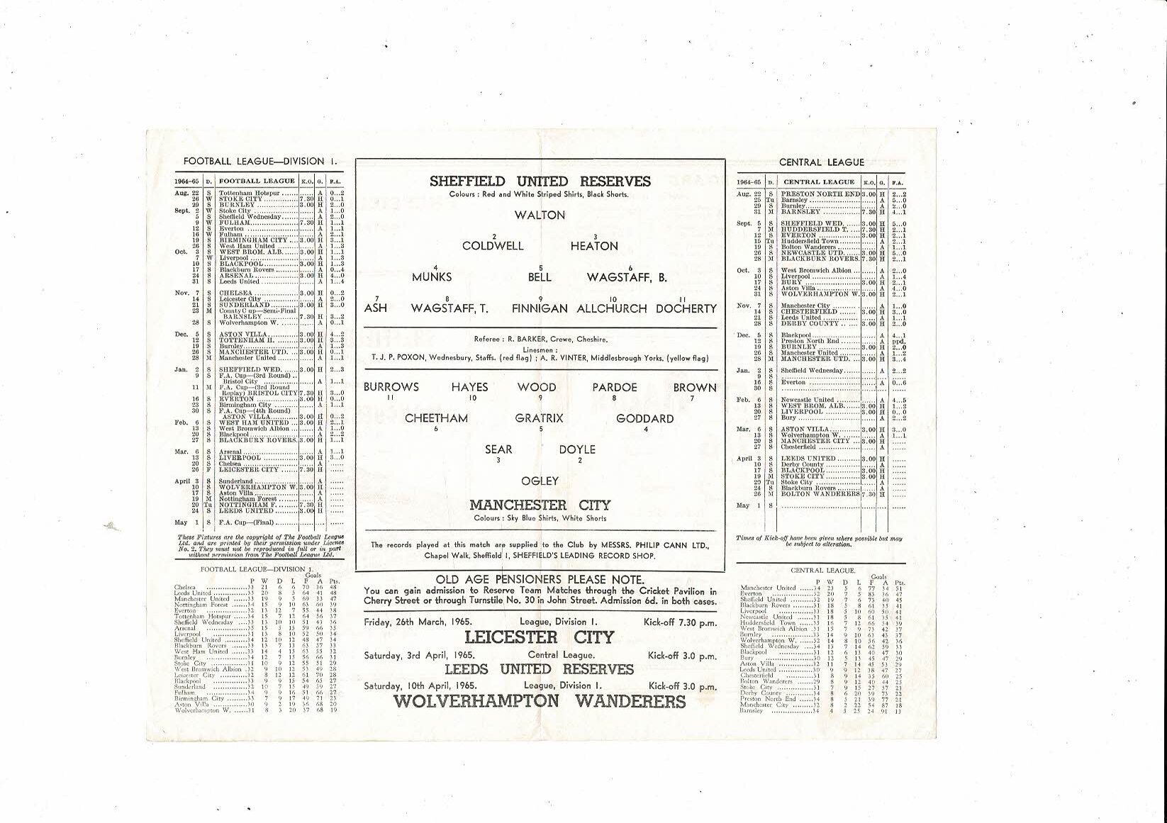 Sheffield United v Manchester City Central League Football Programme 1964/65