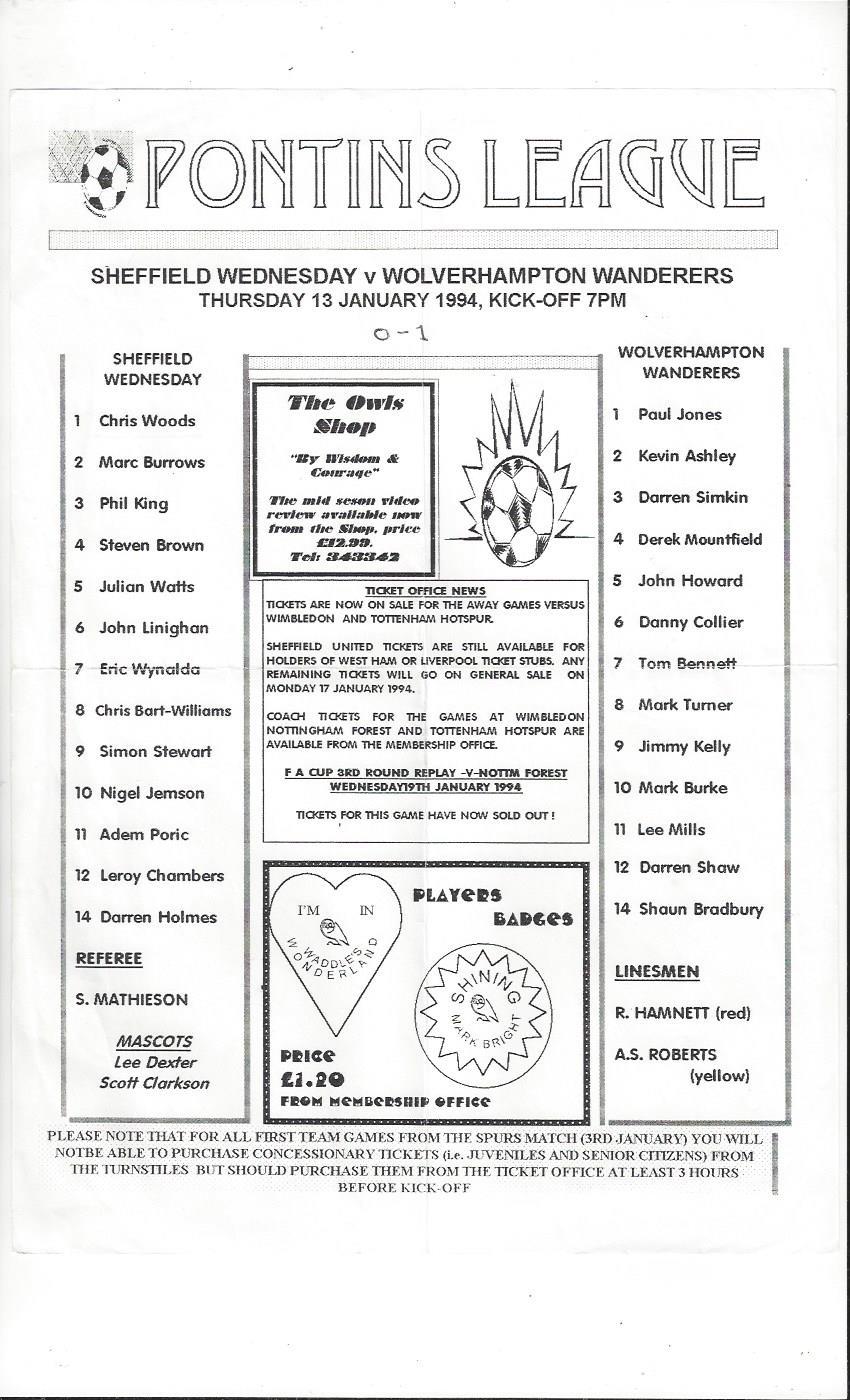 Sheffield Wednesday v Wolves Reserves Pontins League Football Programme 1993/94