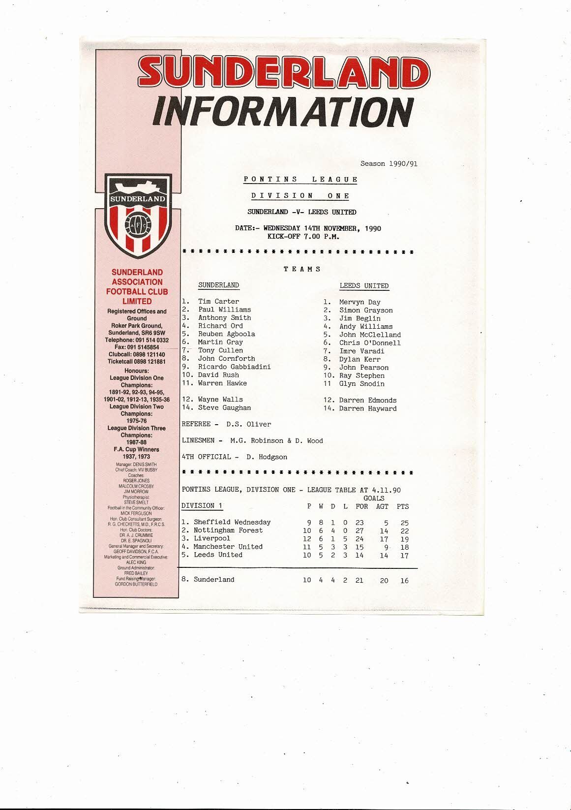 Sunderland v Leeds United Reserves Pontins League Football Programme 1990/91