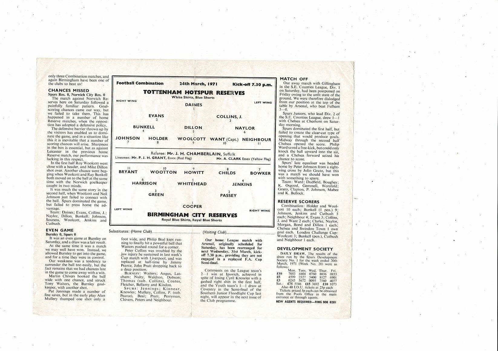 Tottenham Hotspur v Birmingham City Football Combination Programme 1970/71