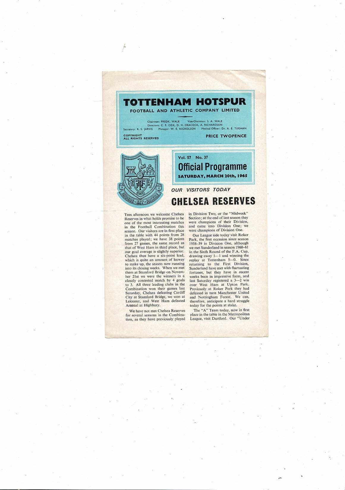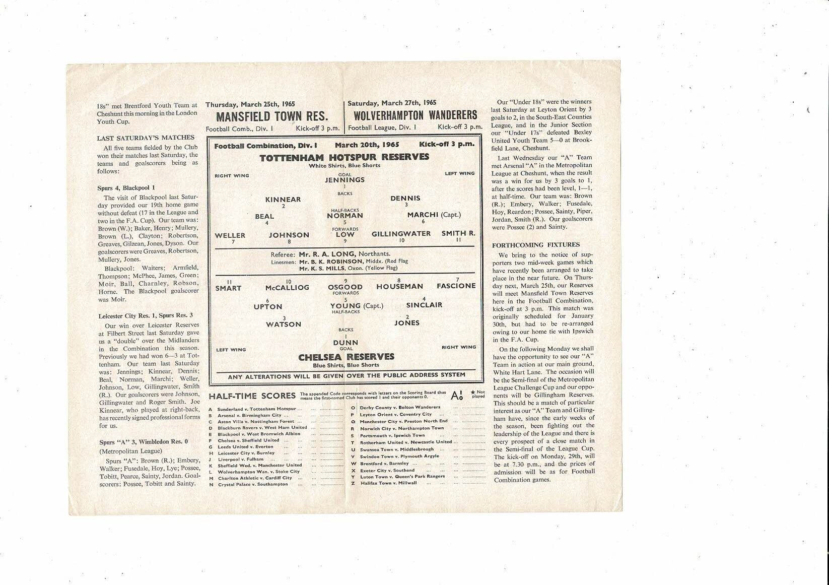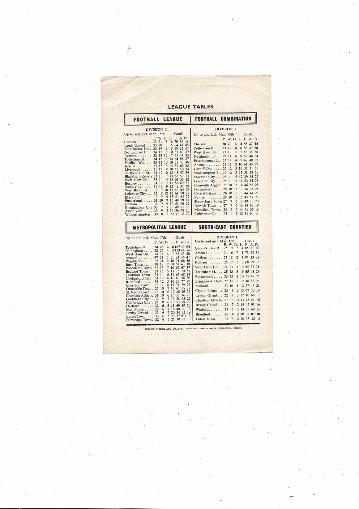 Tottenham Hotspur v Chelsea Football Combination Programme 1964/65 - Postponed