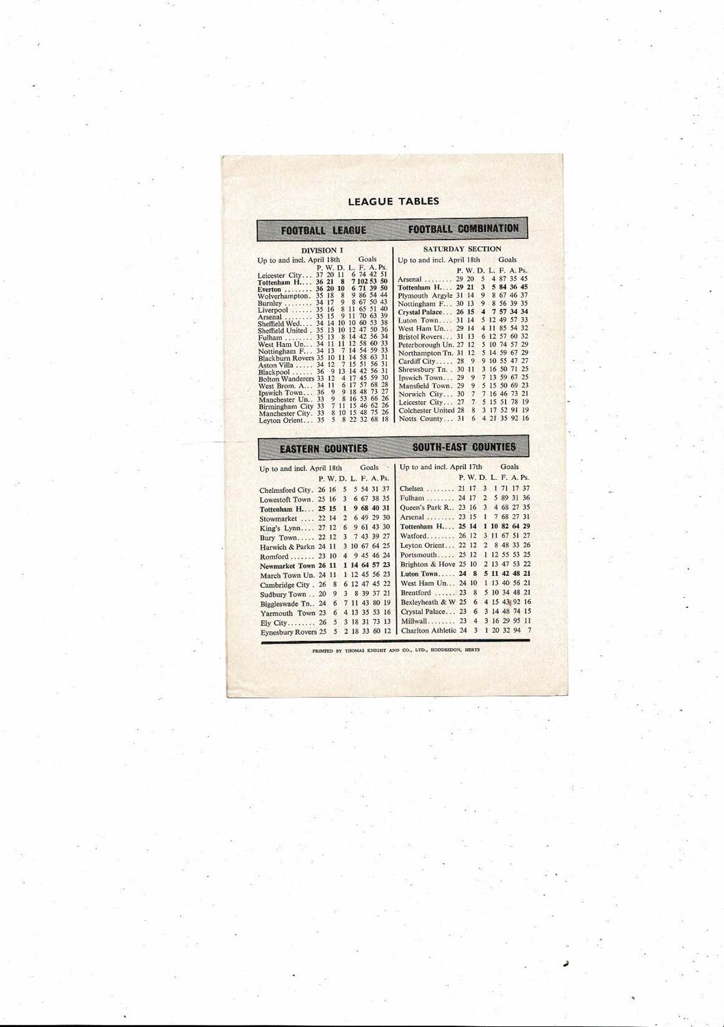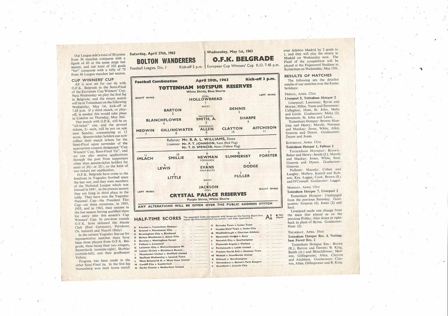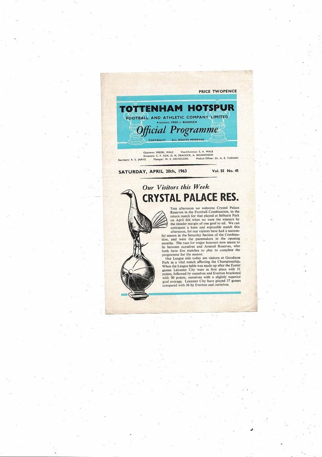 Tottenham Hotspur v Crystal Palace Football Combination Programme 1962/63