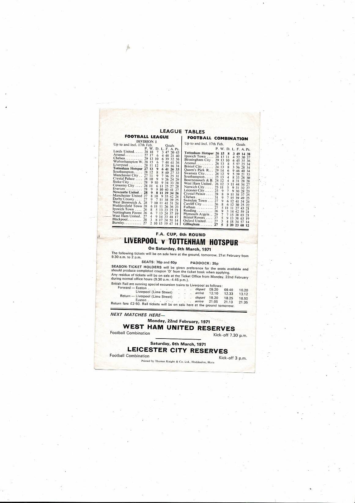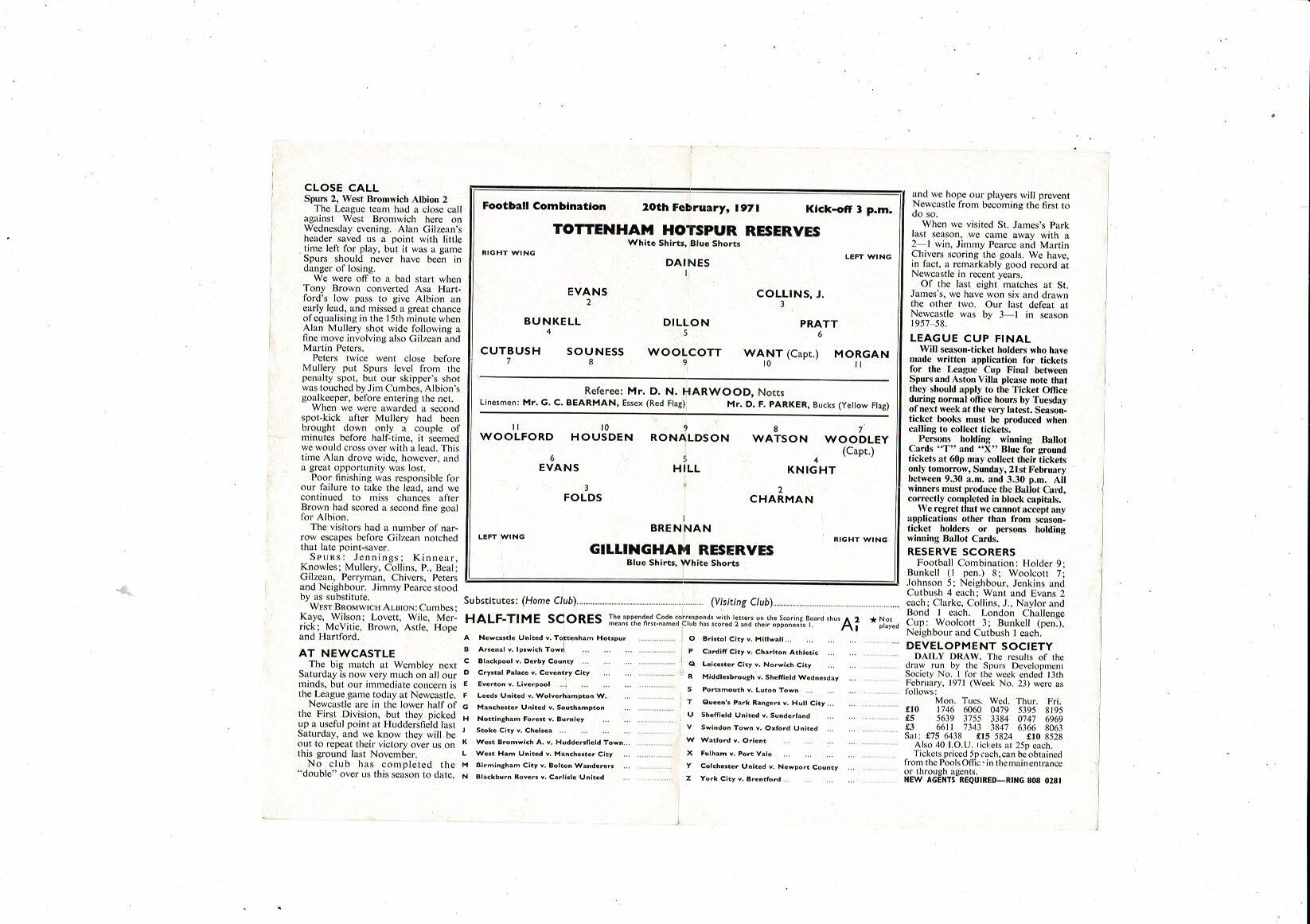 Tottenham Hotspur v Gillingham Football Combination Programme 1970/71