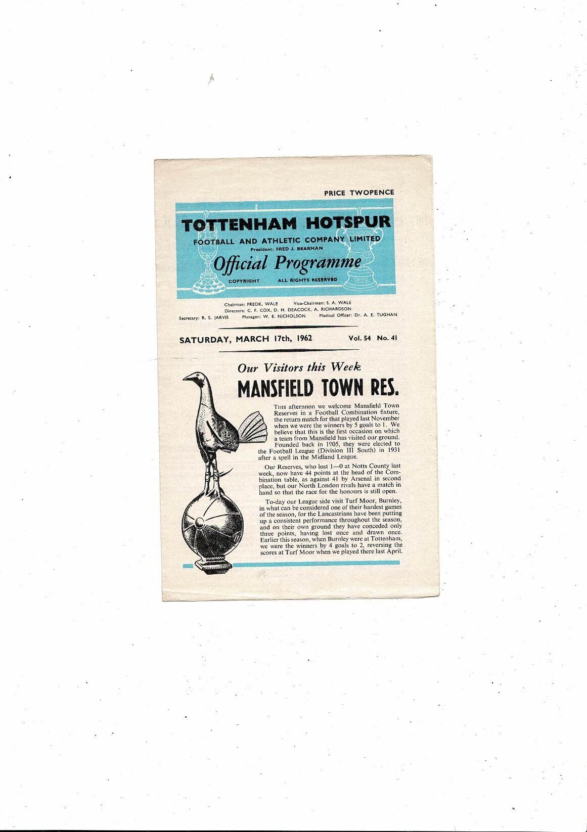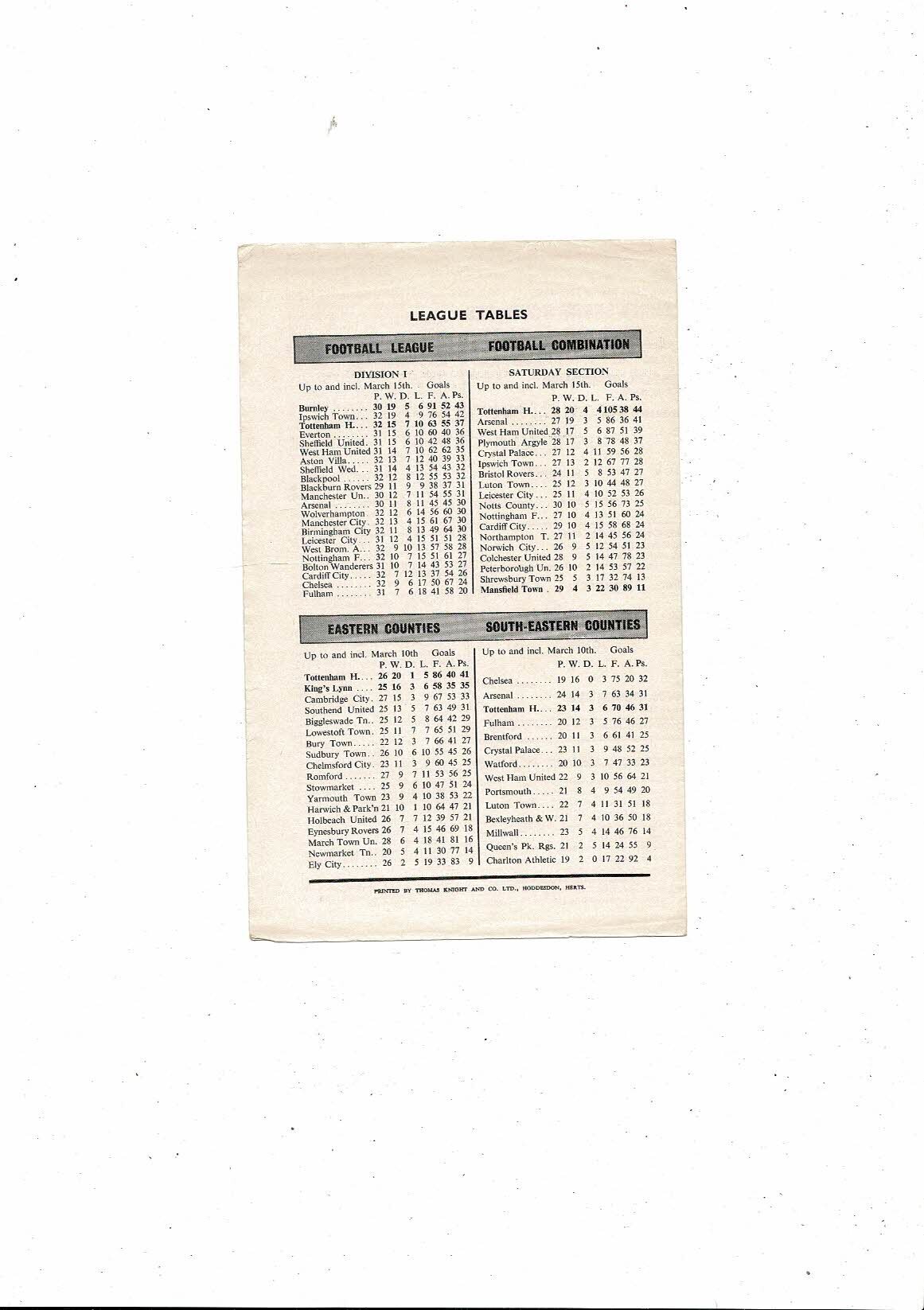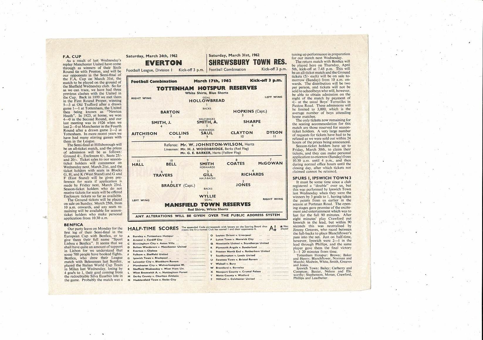 Tottenham Hotspur v Mansfield Town Football Combination Programme 1961/62