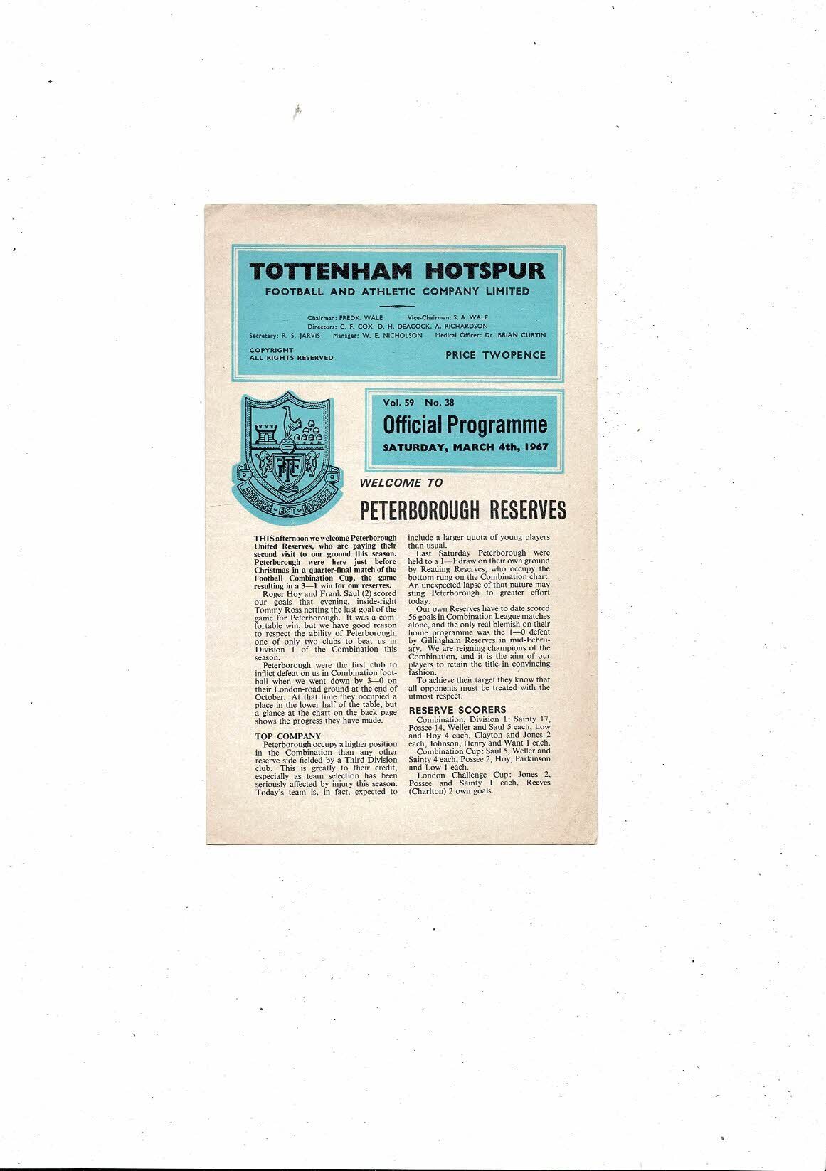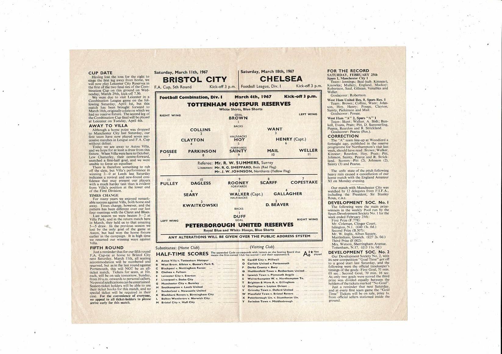 Tottenham Hotspur v Peterborough Football Combination Programme 1966/67