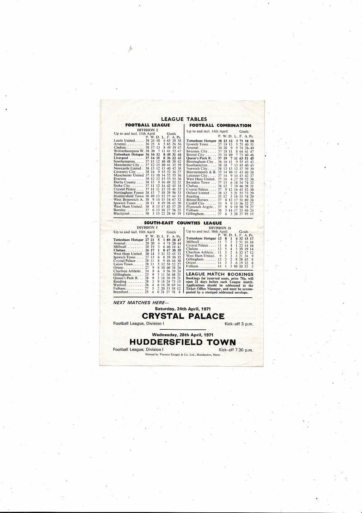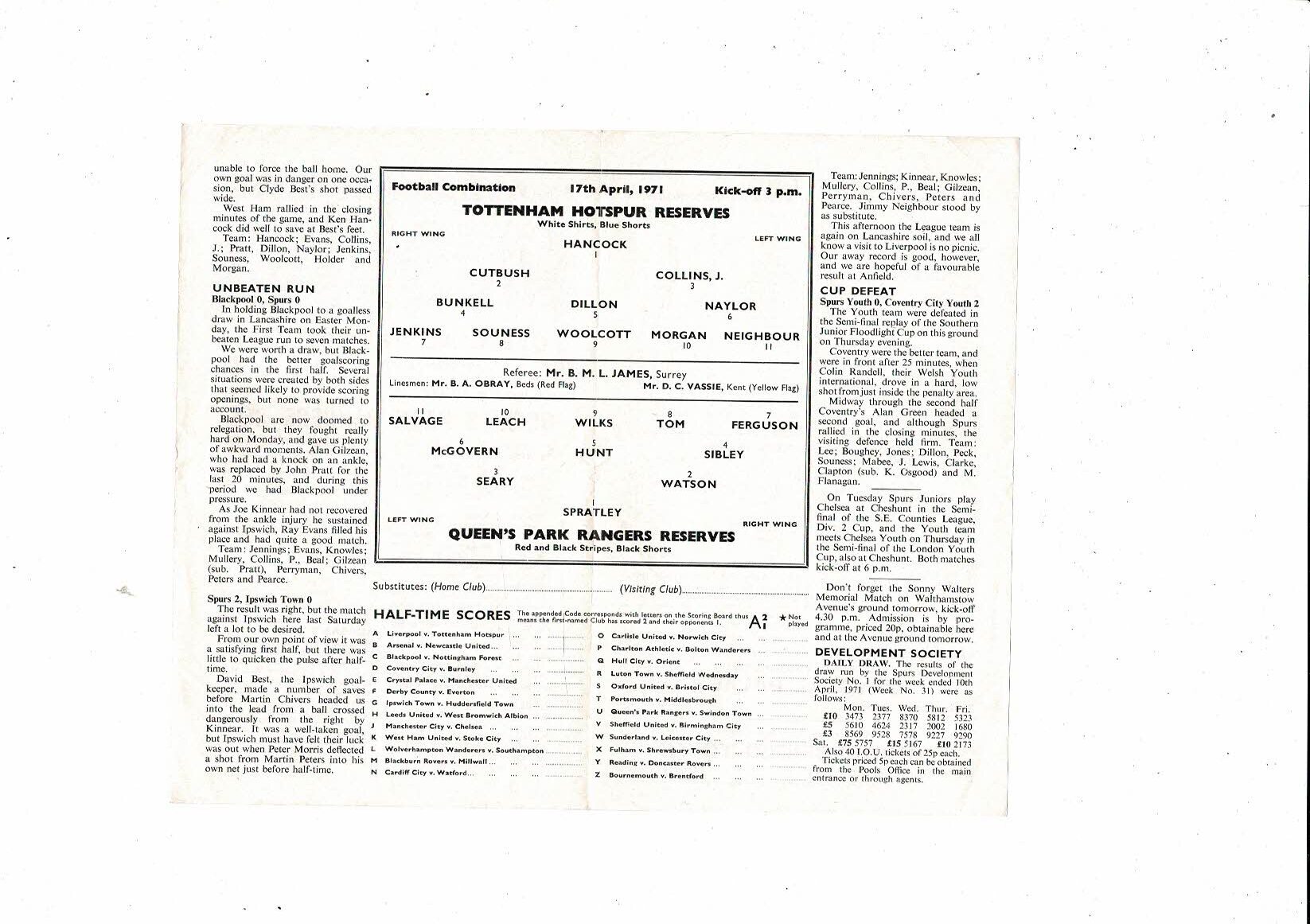 Tottenham Hotspur v Queens Park Rangers Football Combiation Programme 1970/71
