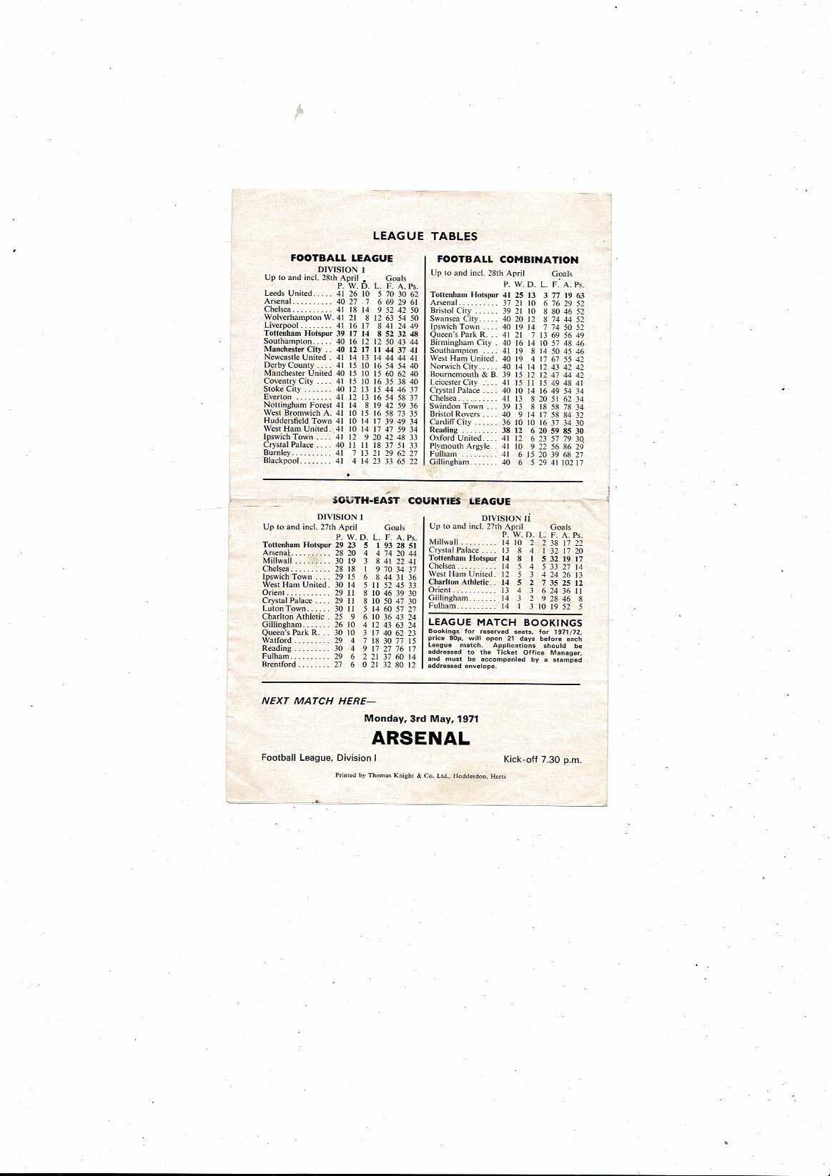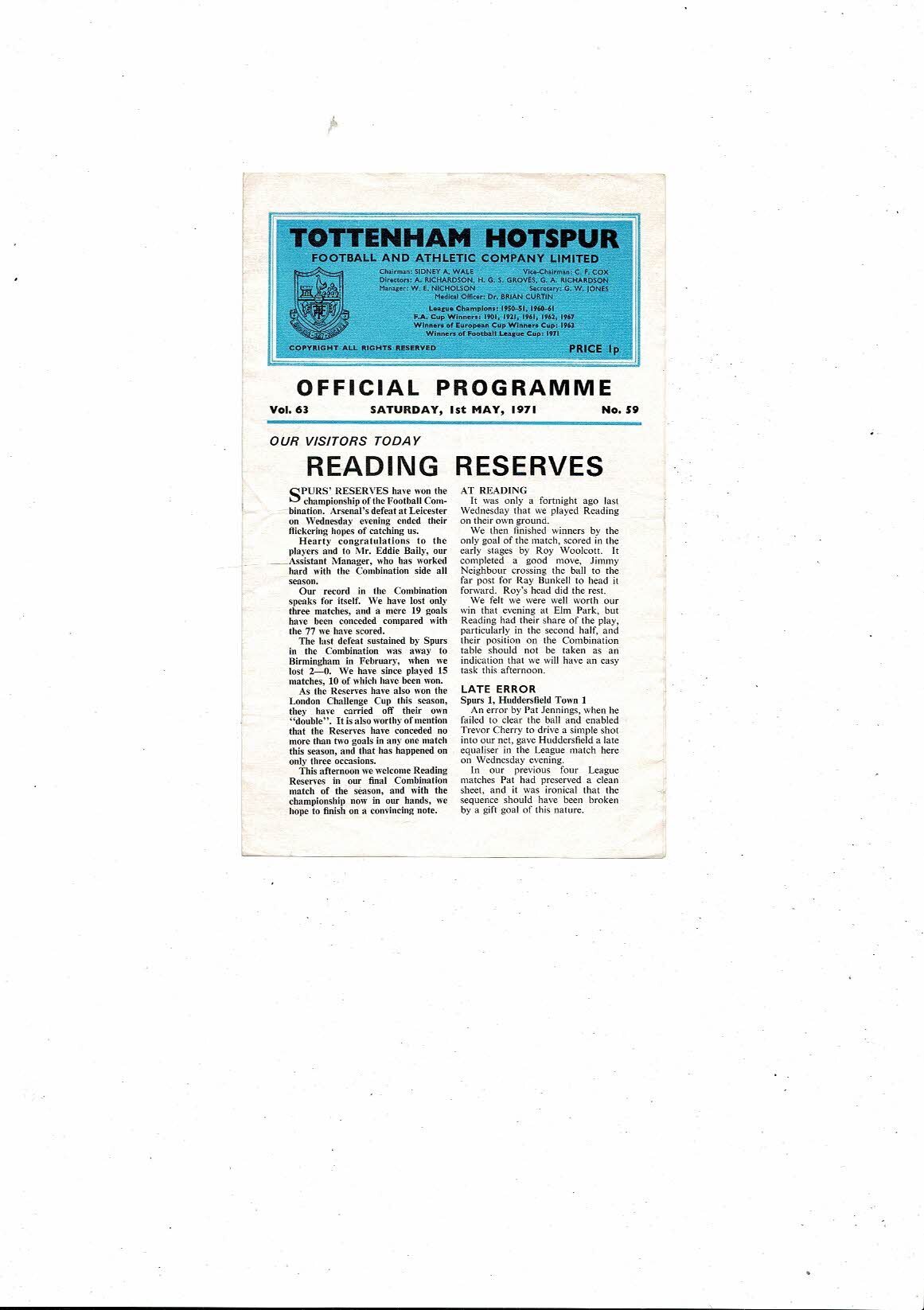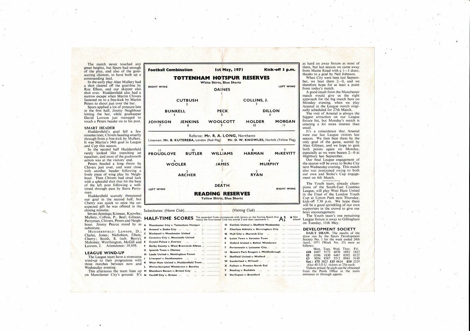 Tottenham Hotspur v Reading Football Combination Football Programme 1970/71