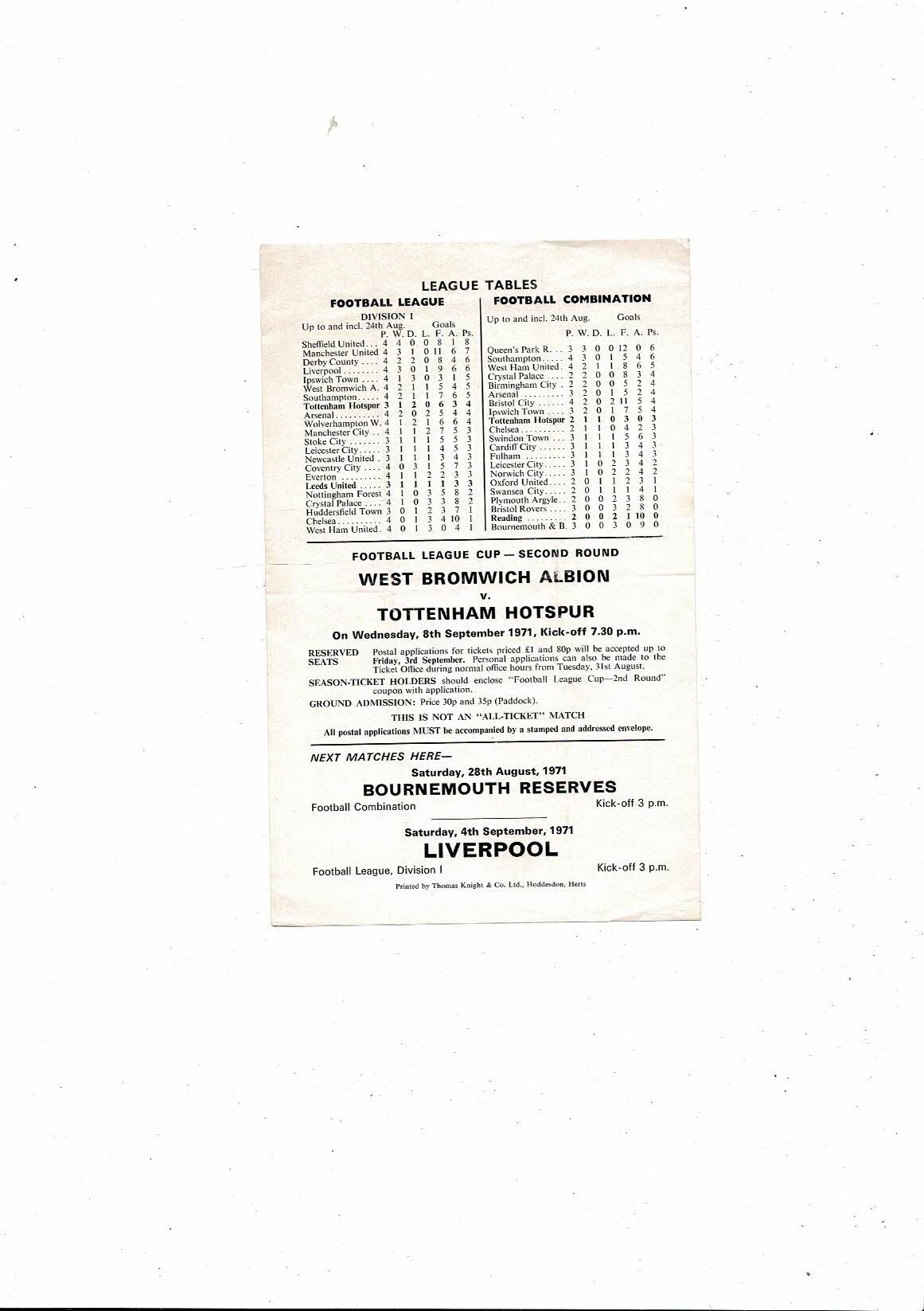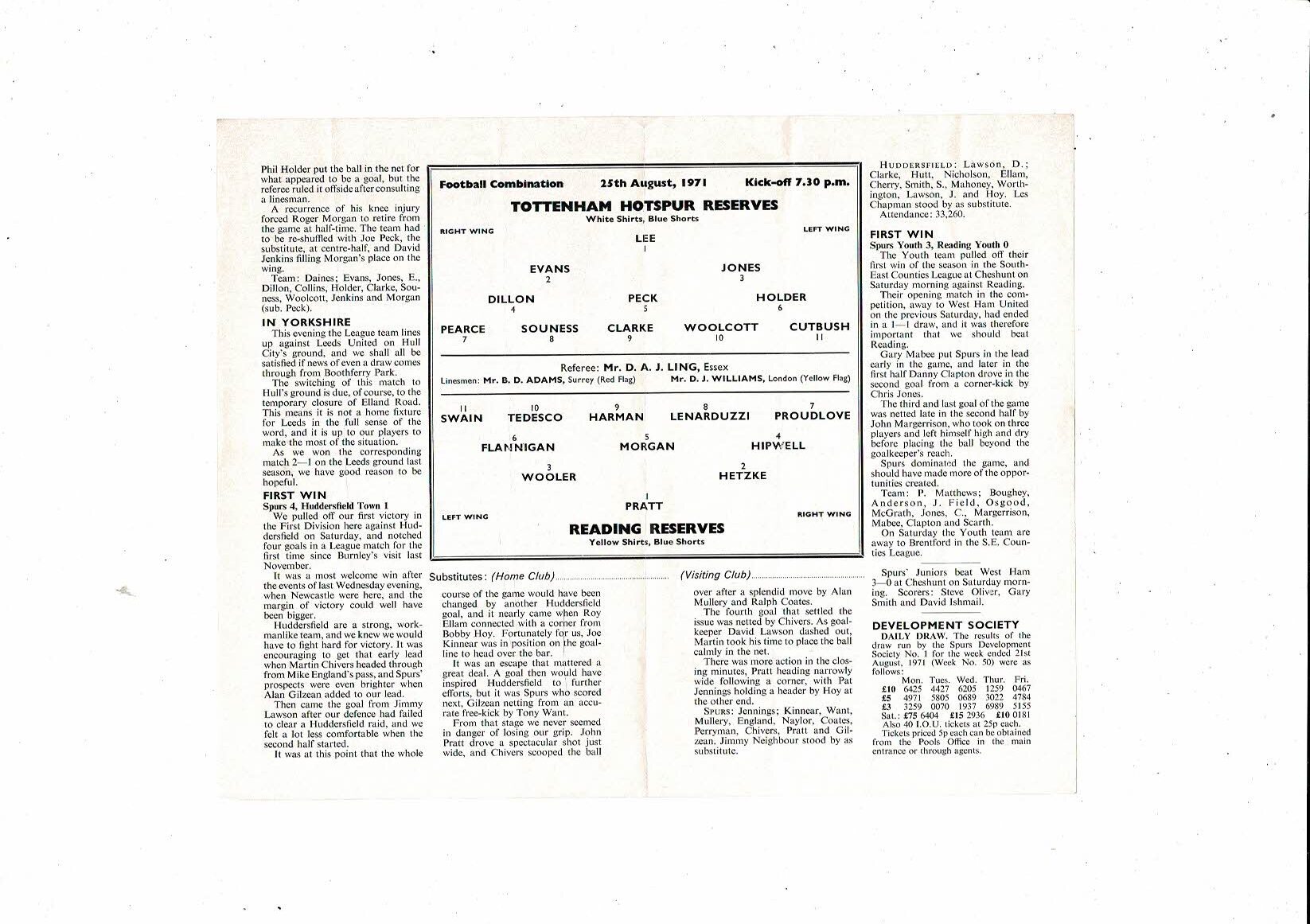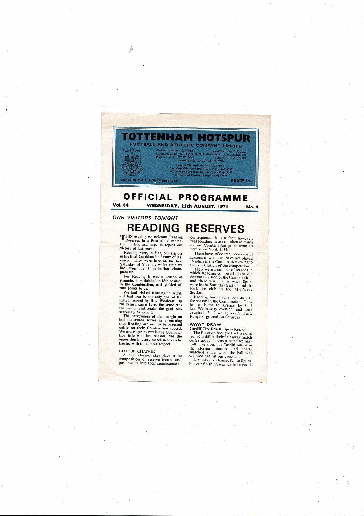Tottenham Hotspur v Reading Football Combination Programme 1971/72