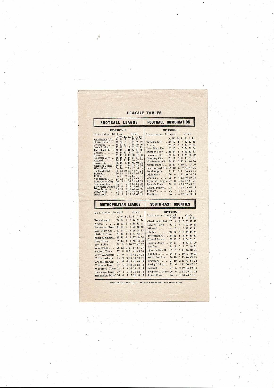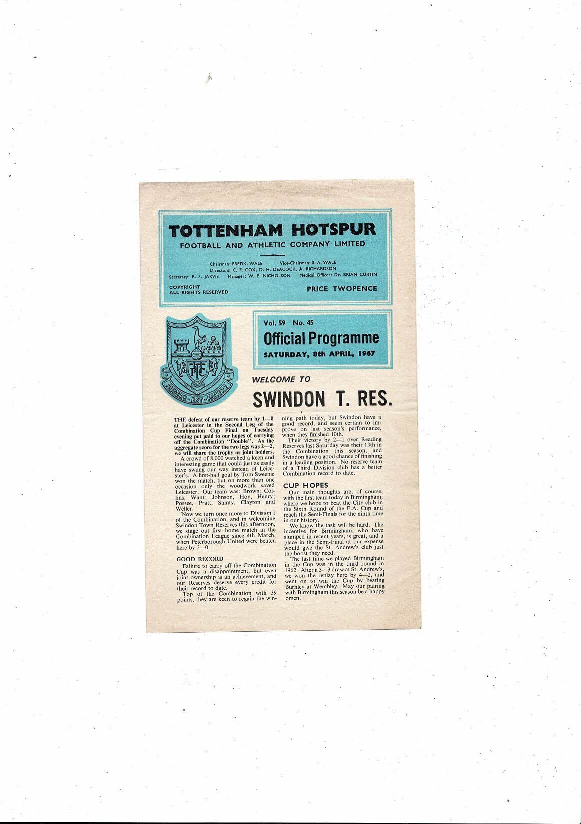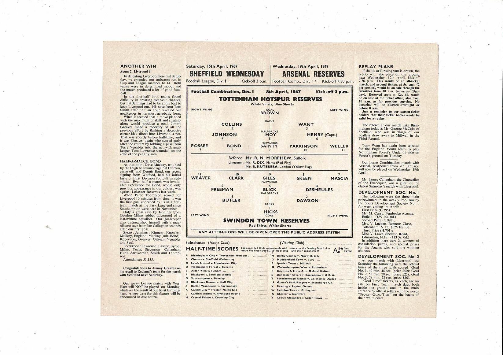 Tottenham Hotspur v Swindon Town Football Combination Programme 1966/67