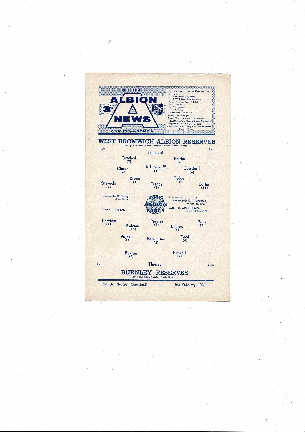 West Bromwich Albion v Burnley Central League Football Programme 1964/65