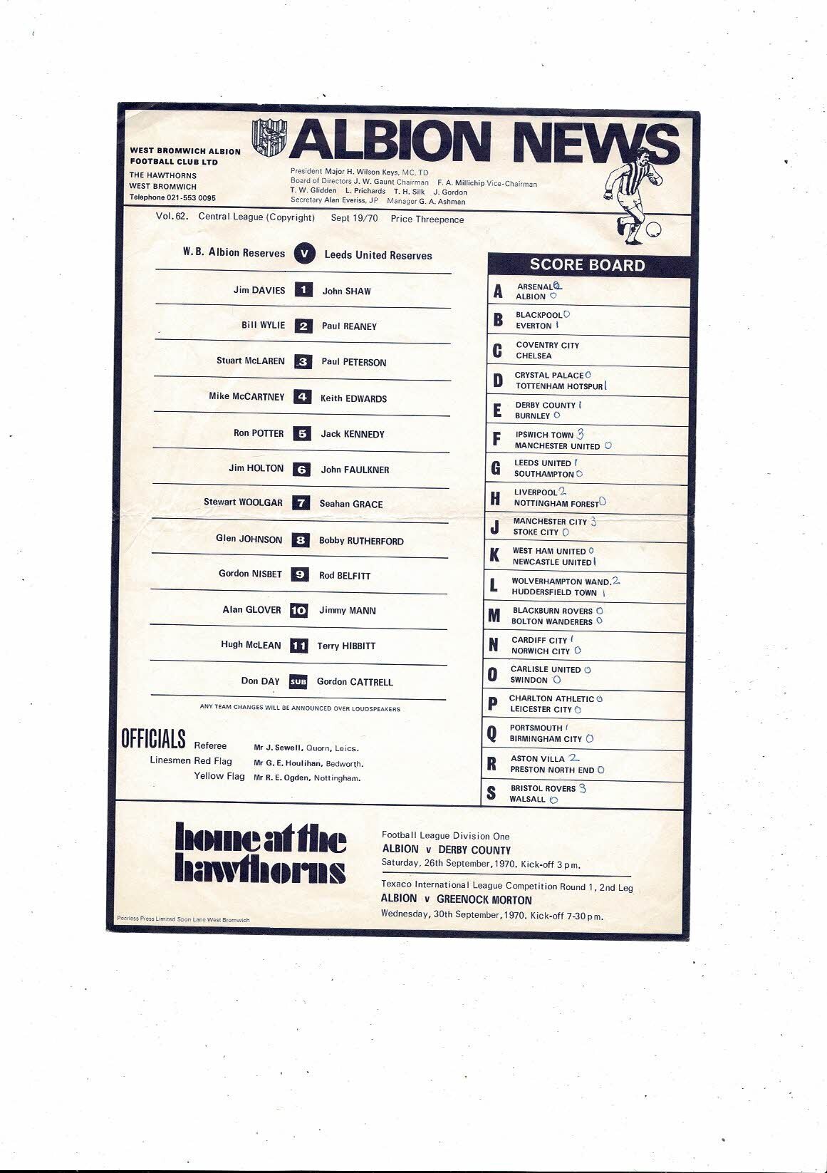 West Bromwich Albion v Leeds United Central League Football Programme 1970/71