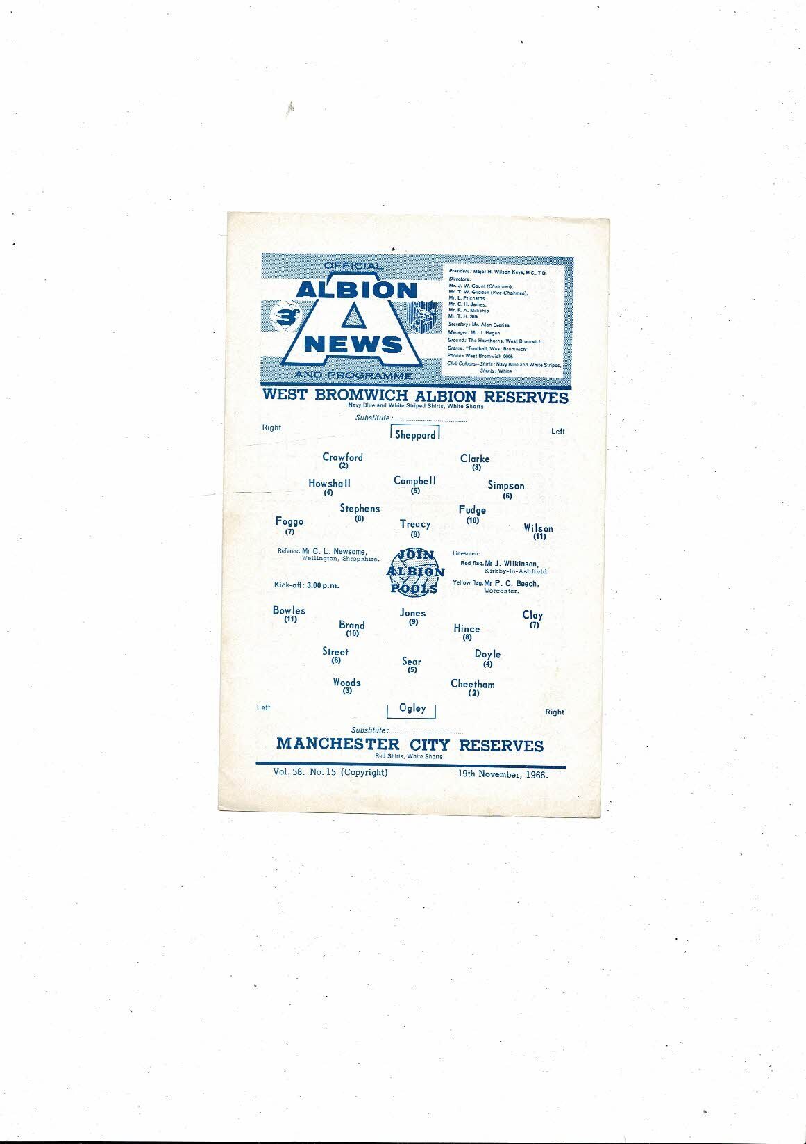 West Bromwich Albion v Manchester City Central League Football Programme 1966/67