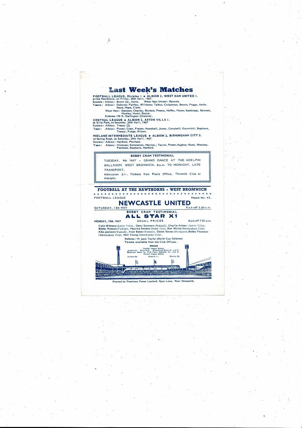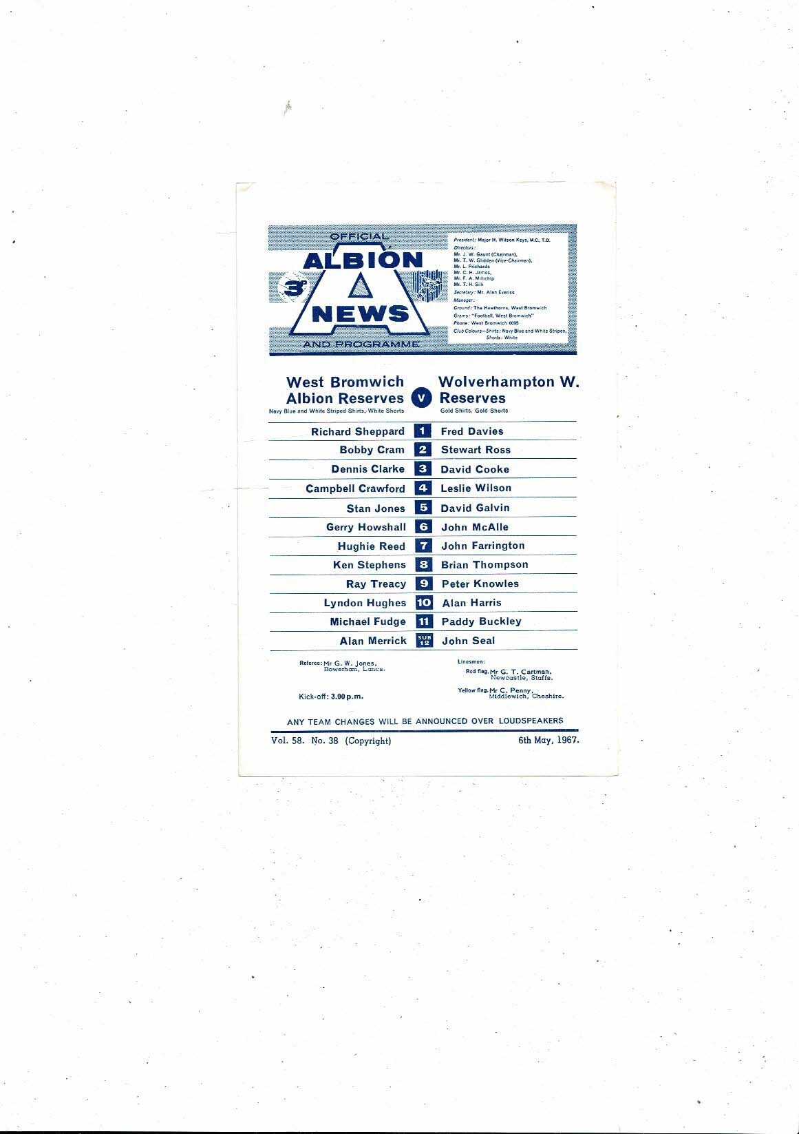 West Bromwich Albion v Wolves Central League Football Programme 1966/67