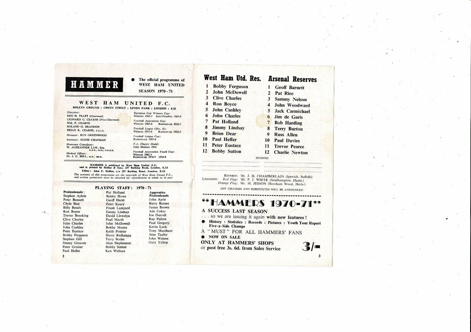 West Ham United v Arsenal Combination Cup Final Football Programme 1970/71