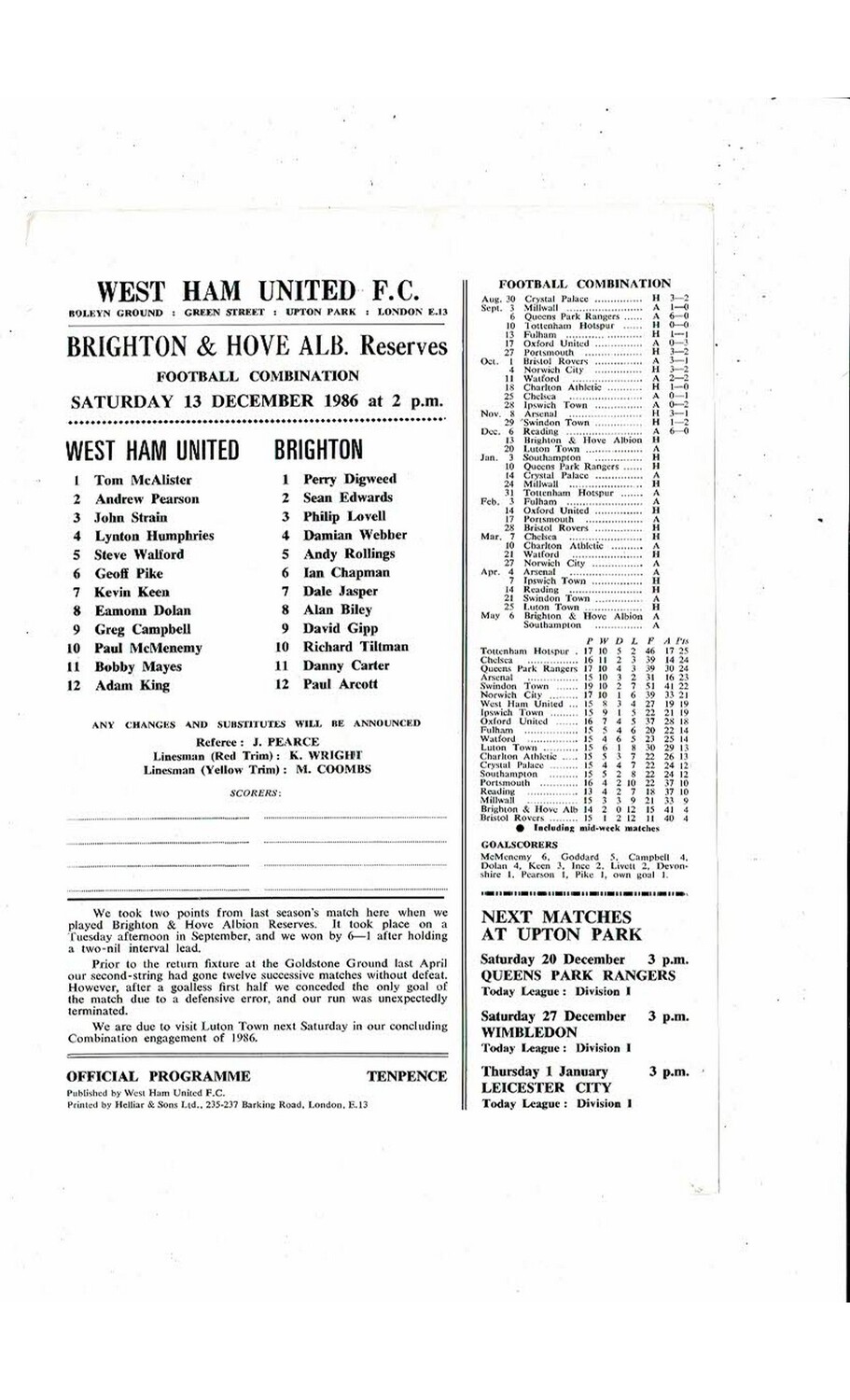 West Ham United v Brighton Football Combination Programme 1986/87