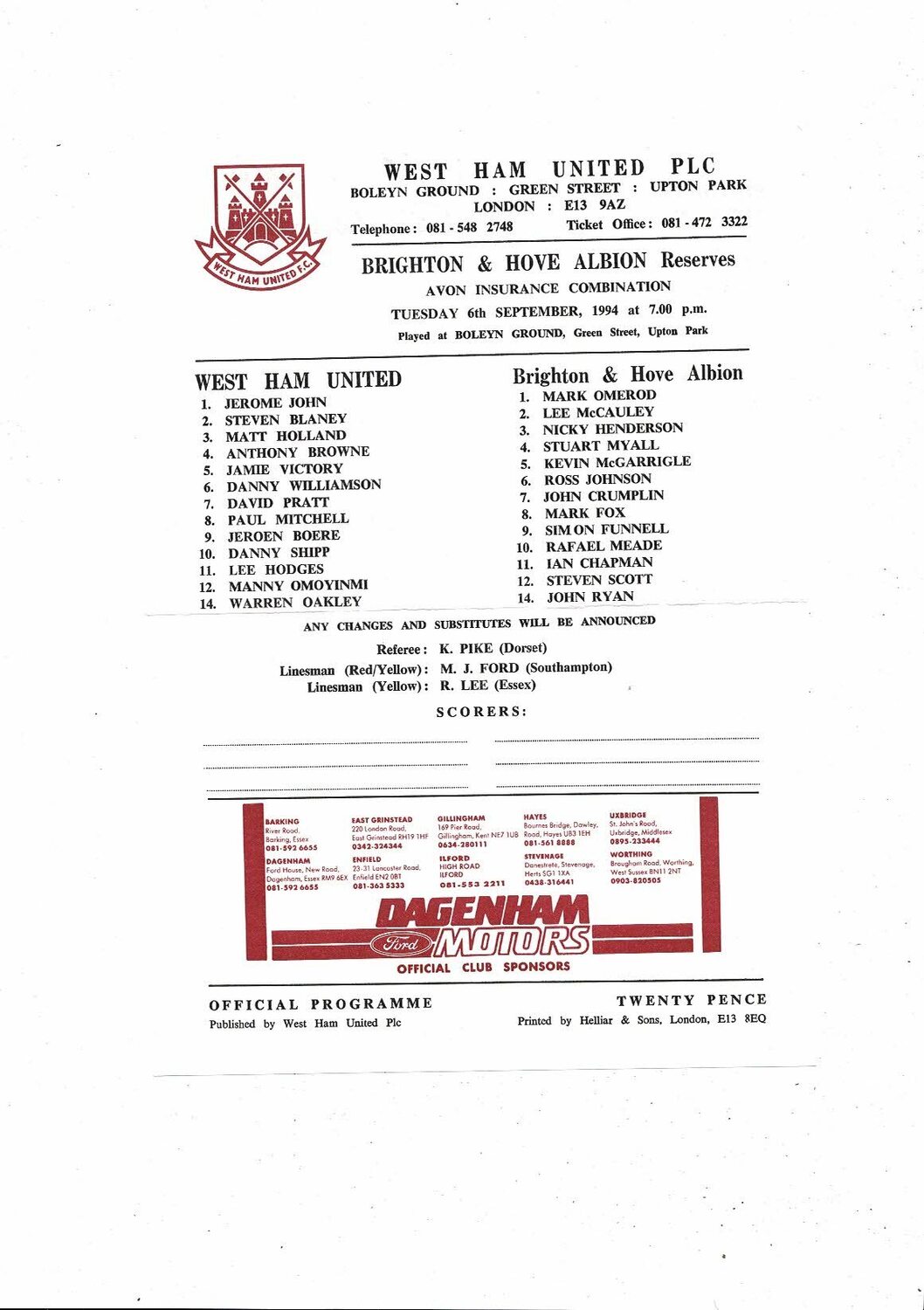 West Ham United v Brighton Football Combination Programme 1994/95