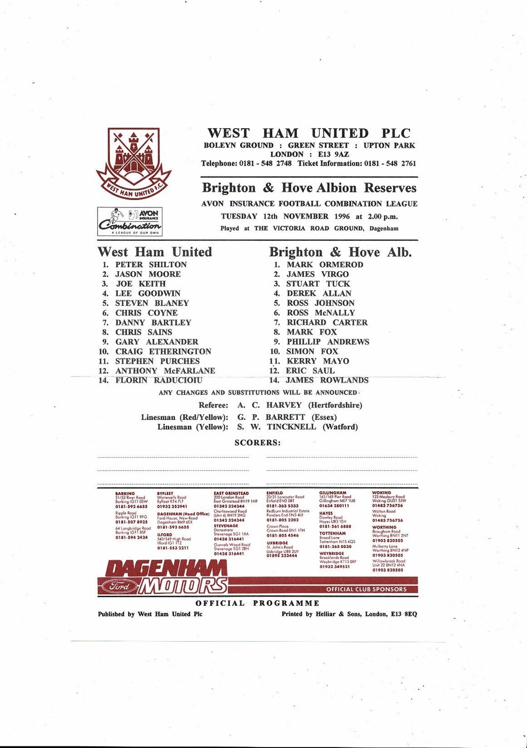 West Ham United v Brighton Football Combination Programme 1996/97