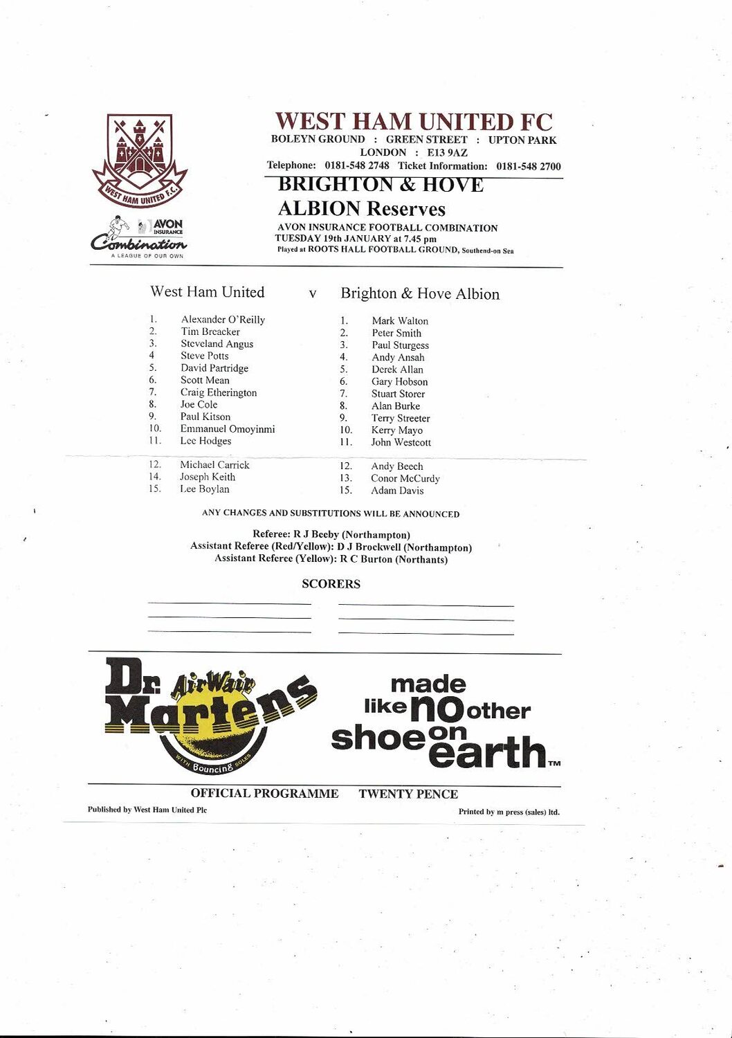West Ham United v Brighton Football Combination Programme 1998/99