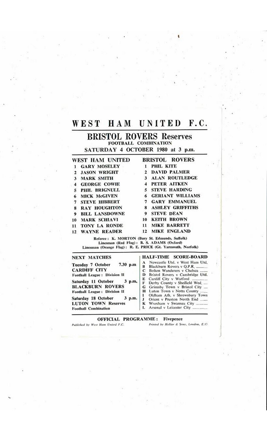West Ham United v Bristol Rovers Football Combination Programme 1980/81