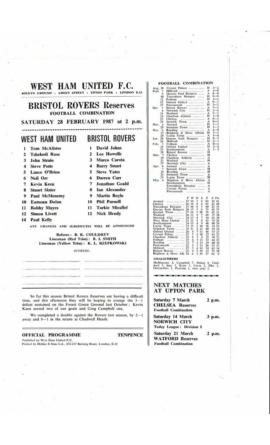 West Ham United v Bristol Rovers Football Combination Programme 1986/87