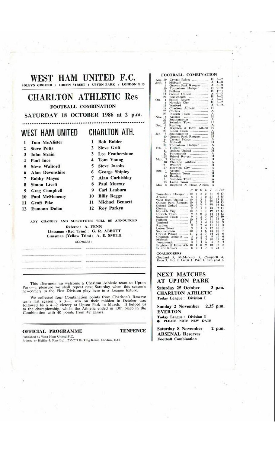 West Ham United v Charlton Athletic Football Combination Programme 1986/87