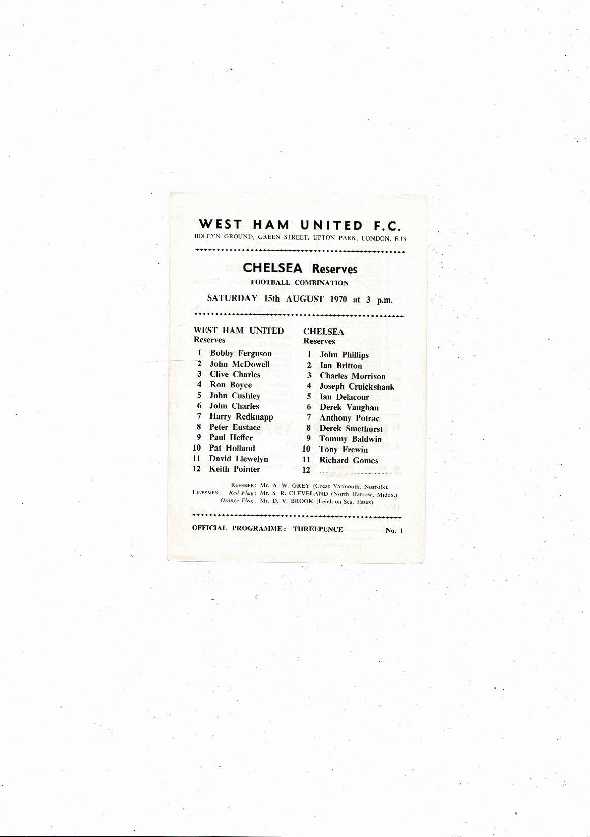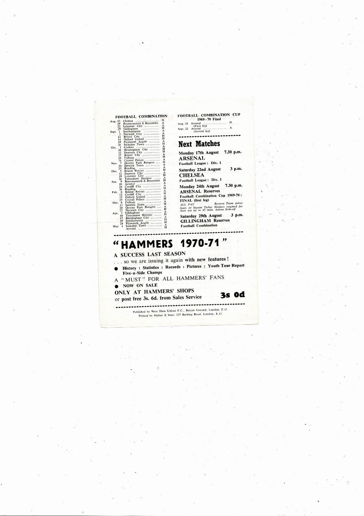 West Ham United v Chelsea Football Combination Programme 1970/71