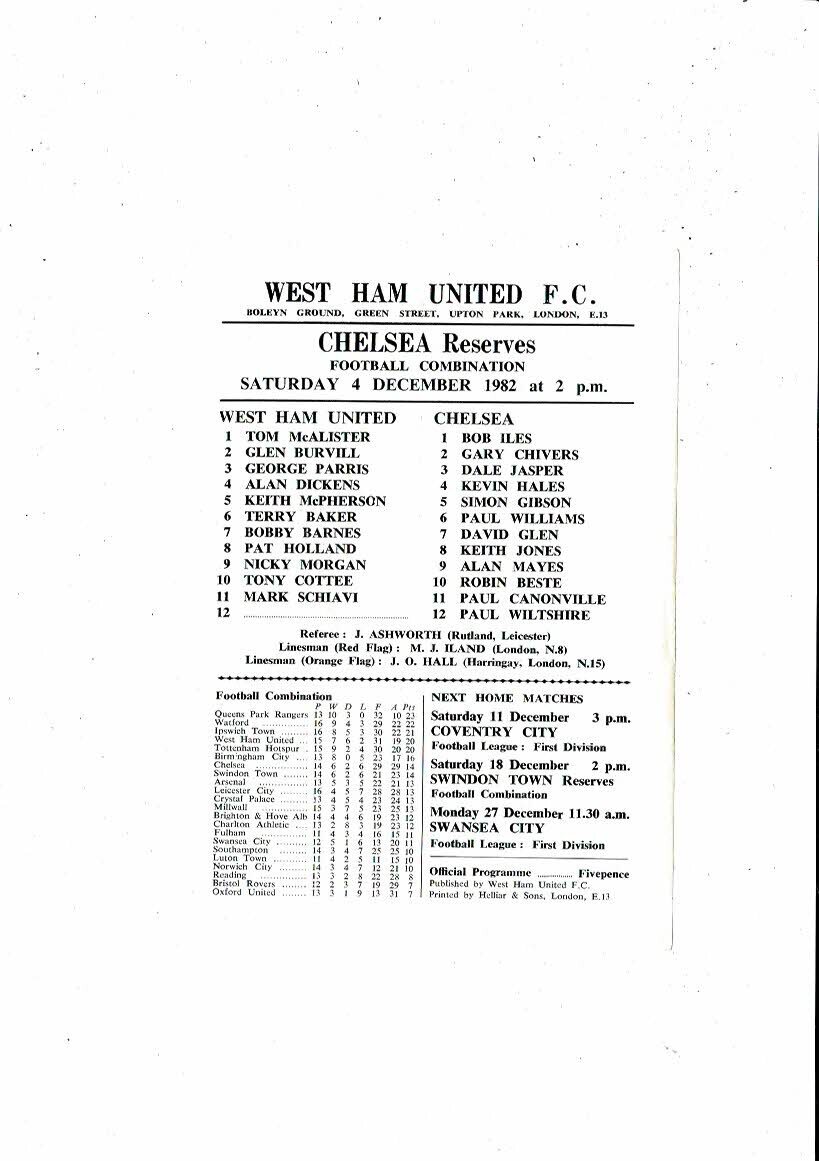 West Ham United v Chelsea Football Combination Programme 1982/83