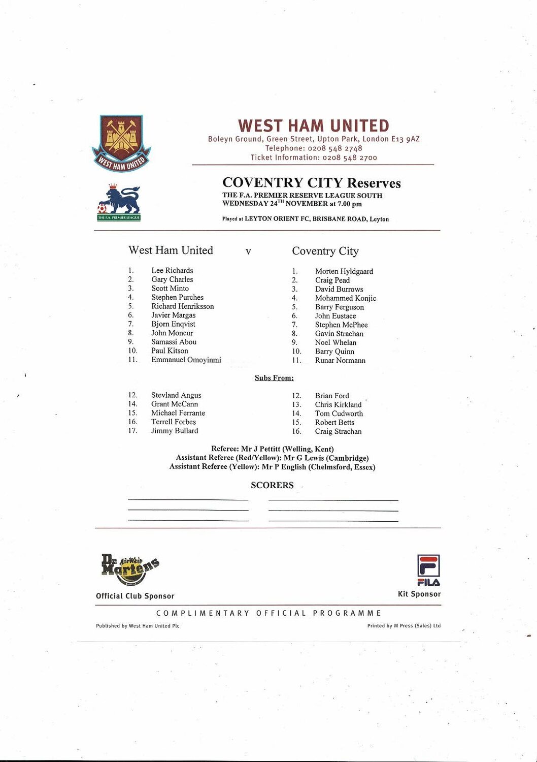West Ham United v Coventry City Football Combination Programme 1999/00