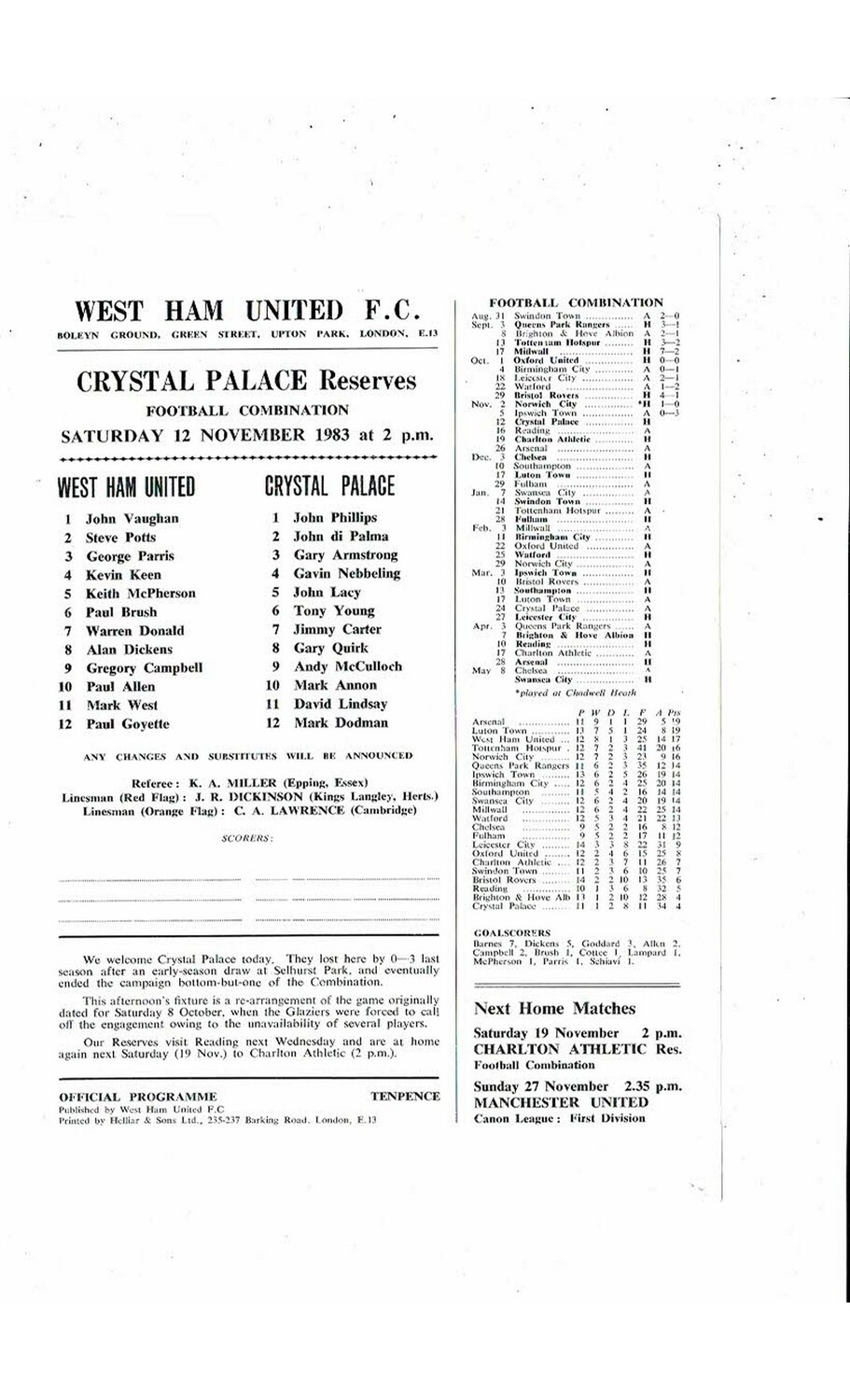 West Ham United v Crystal Palace Football Combination Programme 1983/84