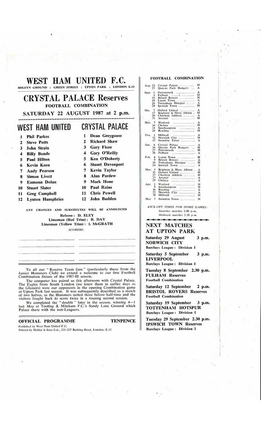 West Ham United v Crystal Palace Football Combination Programme 1987/88