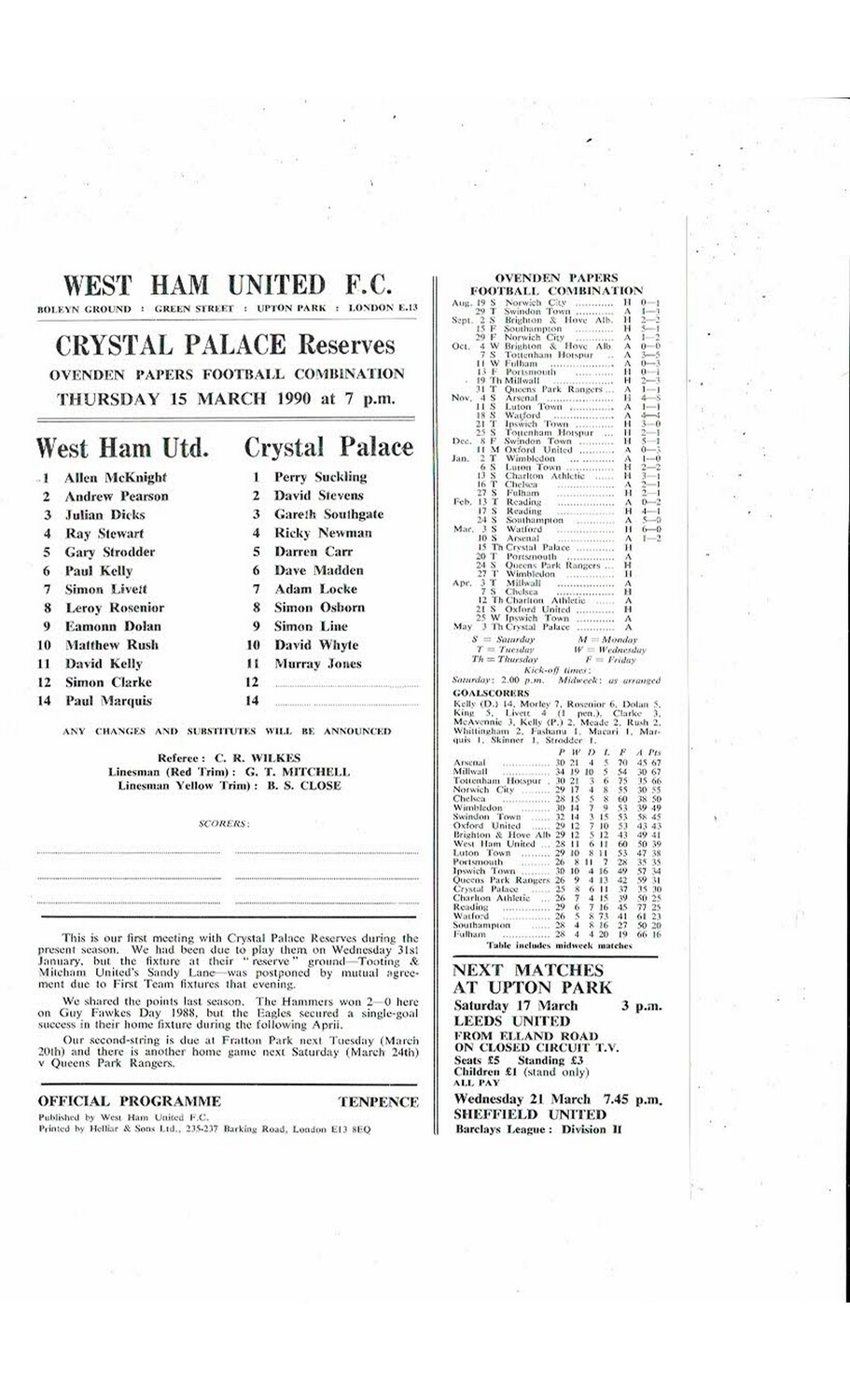West Ham United v Crystal Palace Football Combination Programme 1989/90