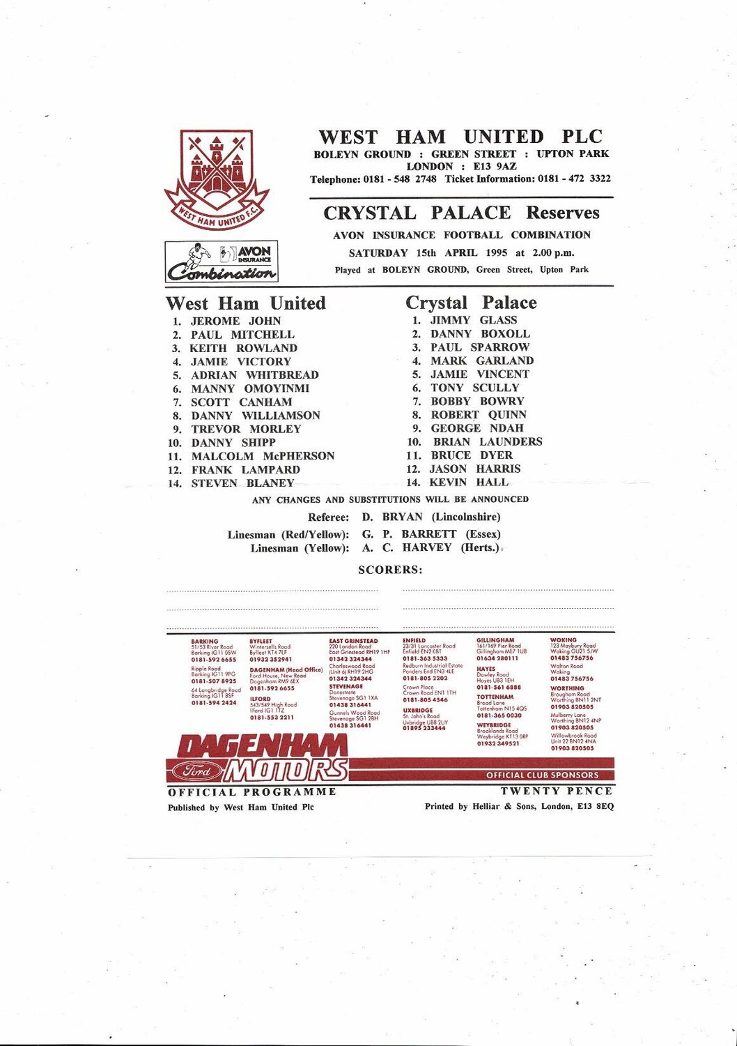 West Ham United v Crystal Palace Football Combination Programme 1994/95