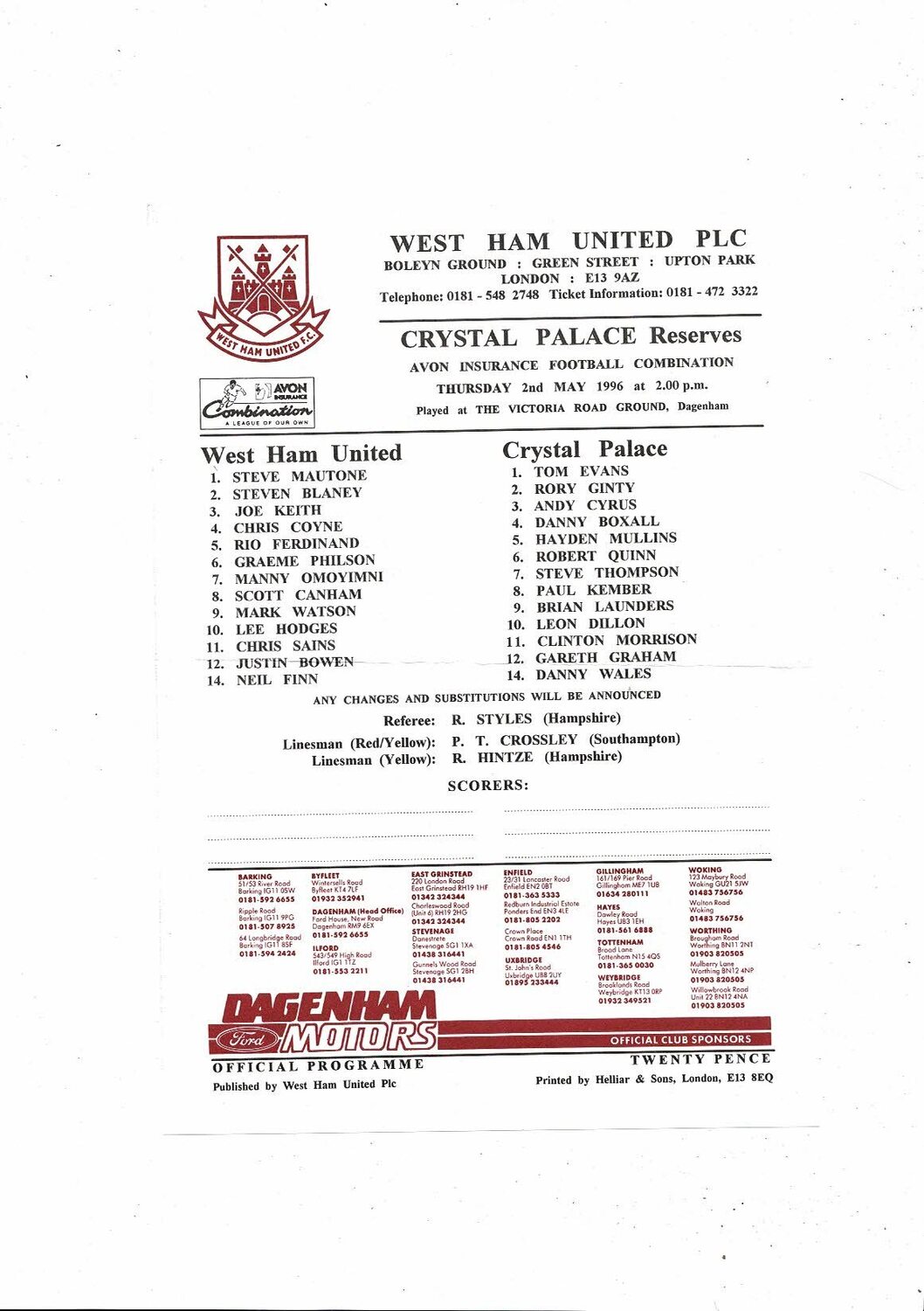 West Ham United v Crystal Palace Football Combination Programme 1995/96