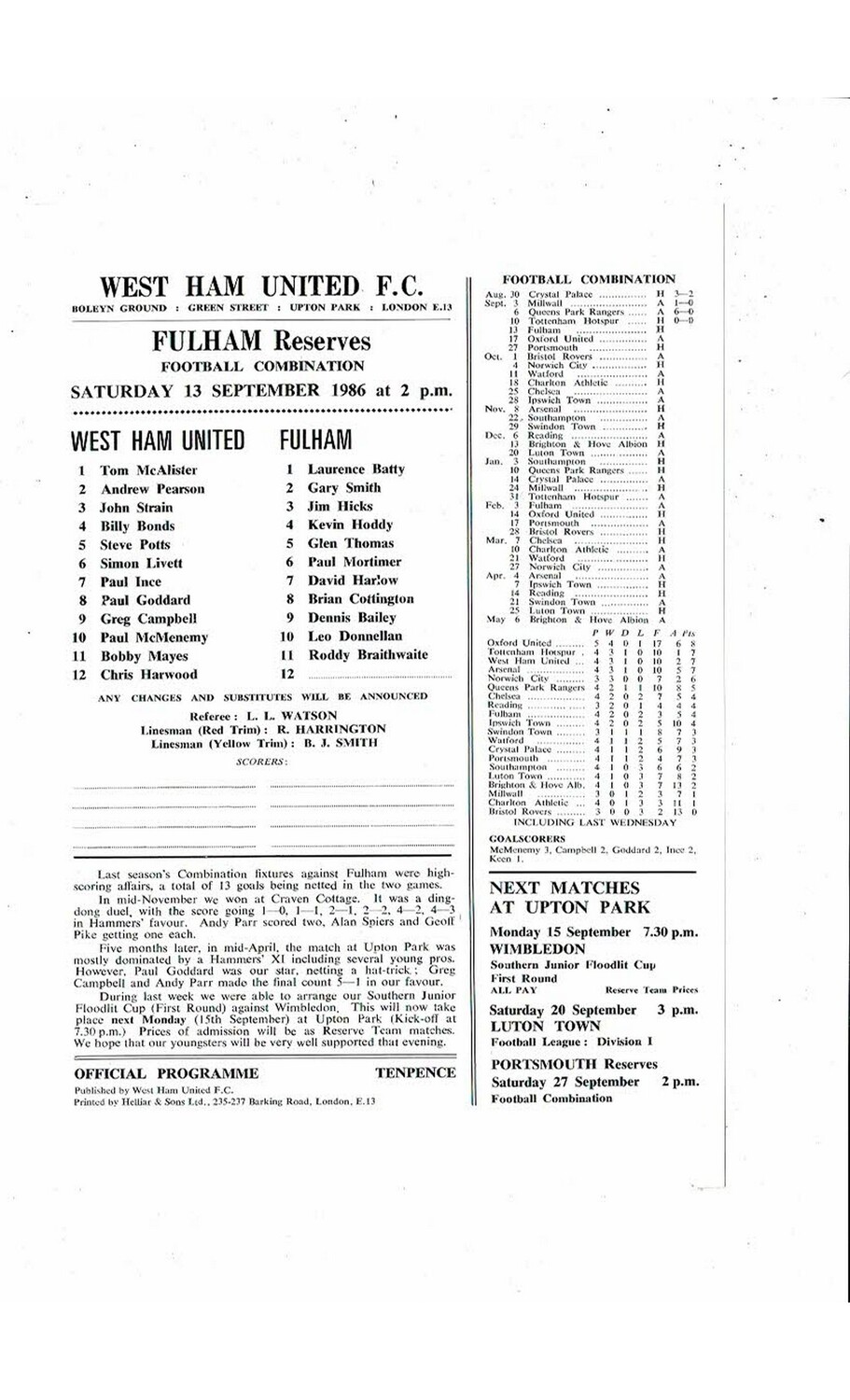 West Ham United v Fulham Football Combination Programme 1986/87