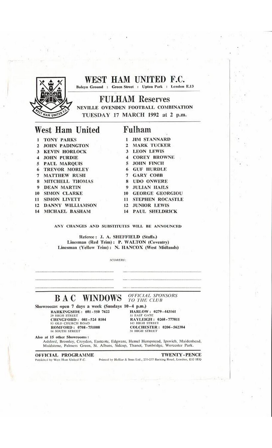 West Ham United v Fulham Football Combination Programme 1991/92