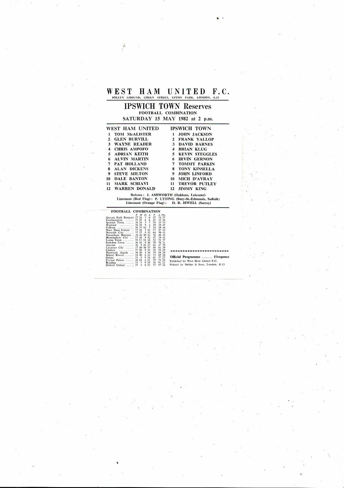 West Ham United v Ipswich Town Football Combination Programme 1981/82
