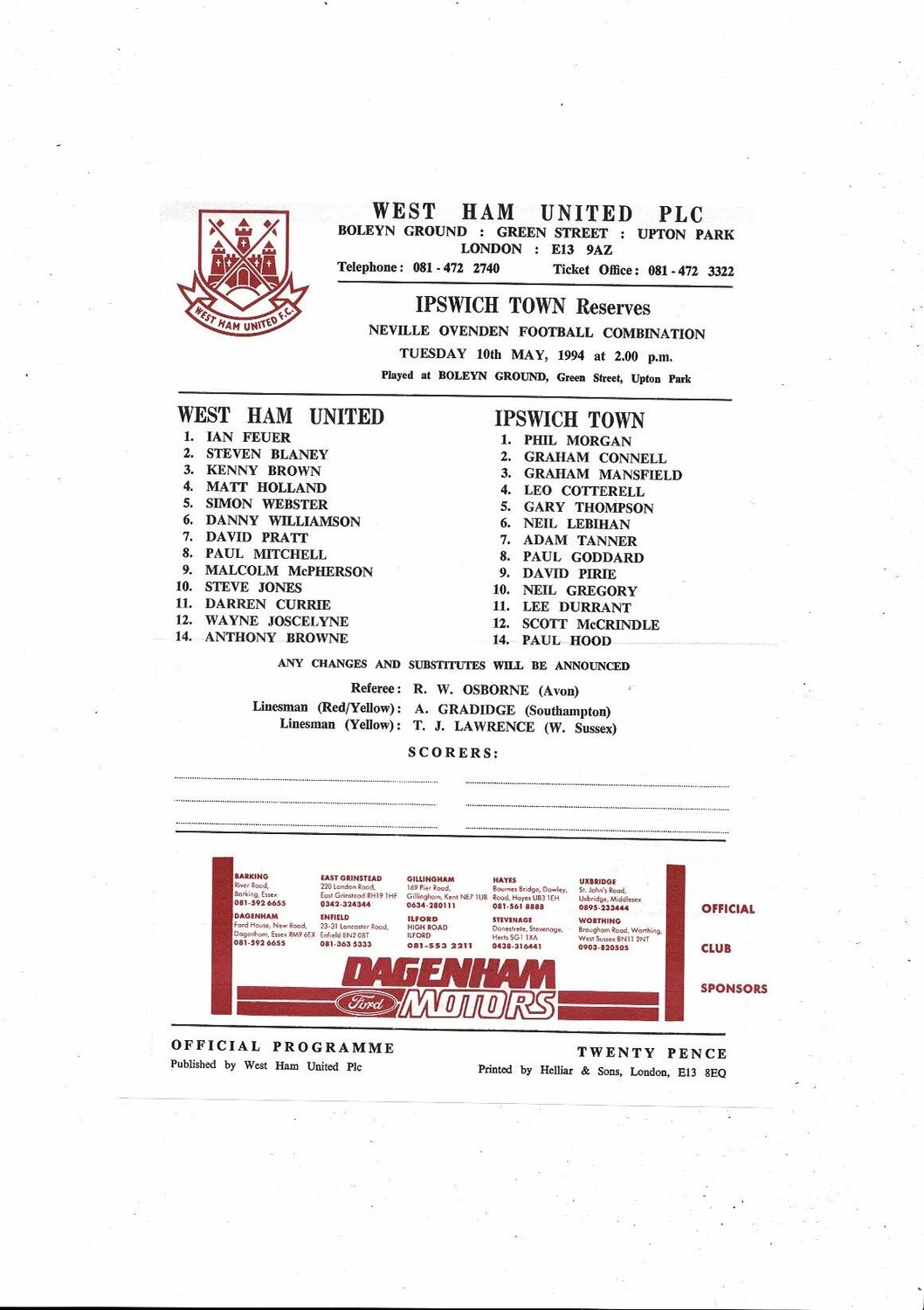 West Ham United v Ipswich Town Football Combination Programme 1993/94