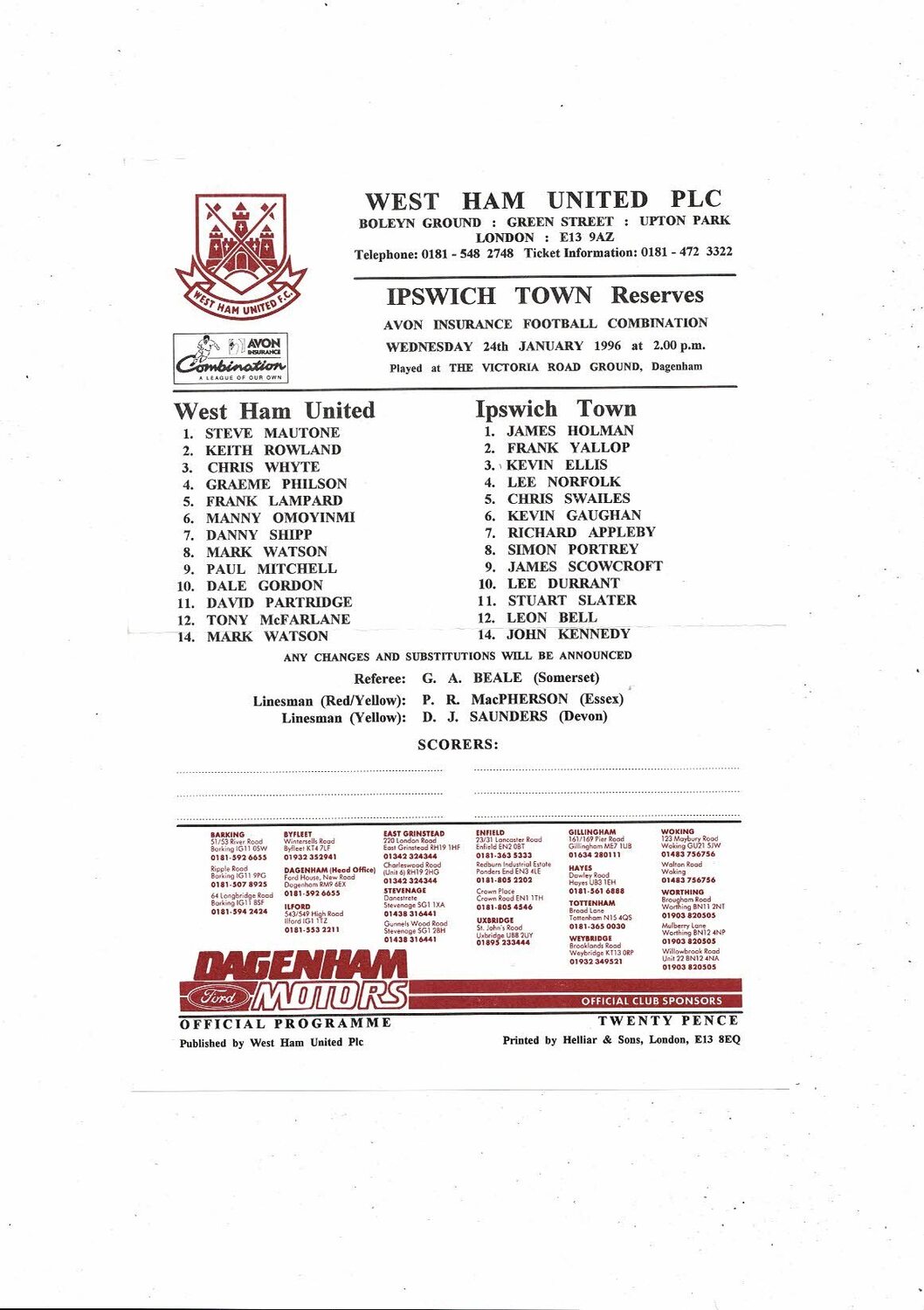West Ham United v Ipswich Town Football Combination Programme 1995/96