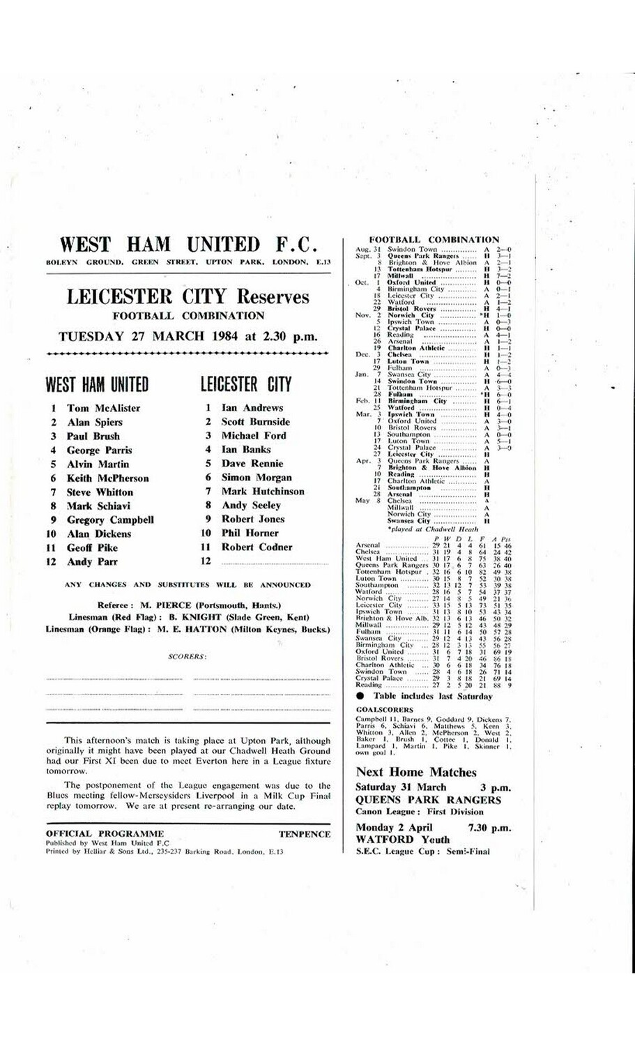 West Ham United v Leicester City Football Combination Programme 1983/84