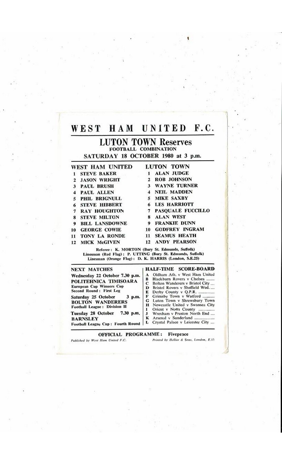 West Ham United v Luton Town Football Combination Programme 1980/81