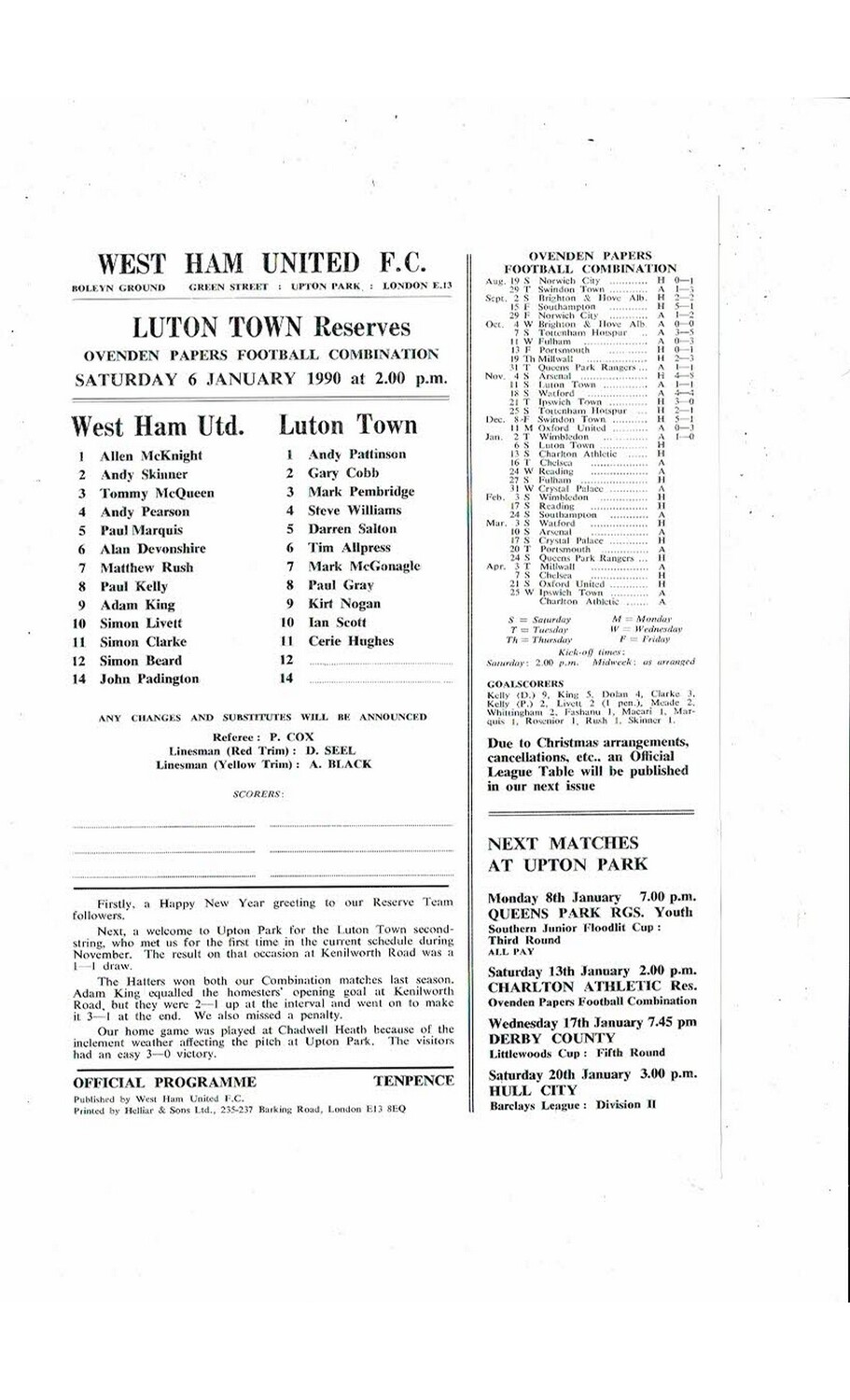 West Ham United v Luton Town Football Combination Programme 1989/90