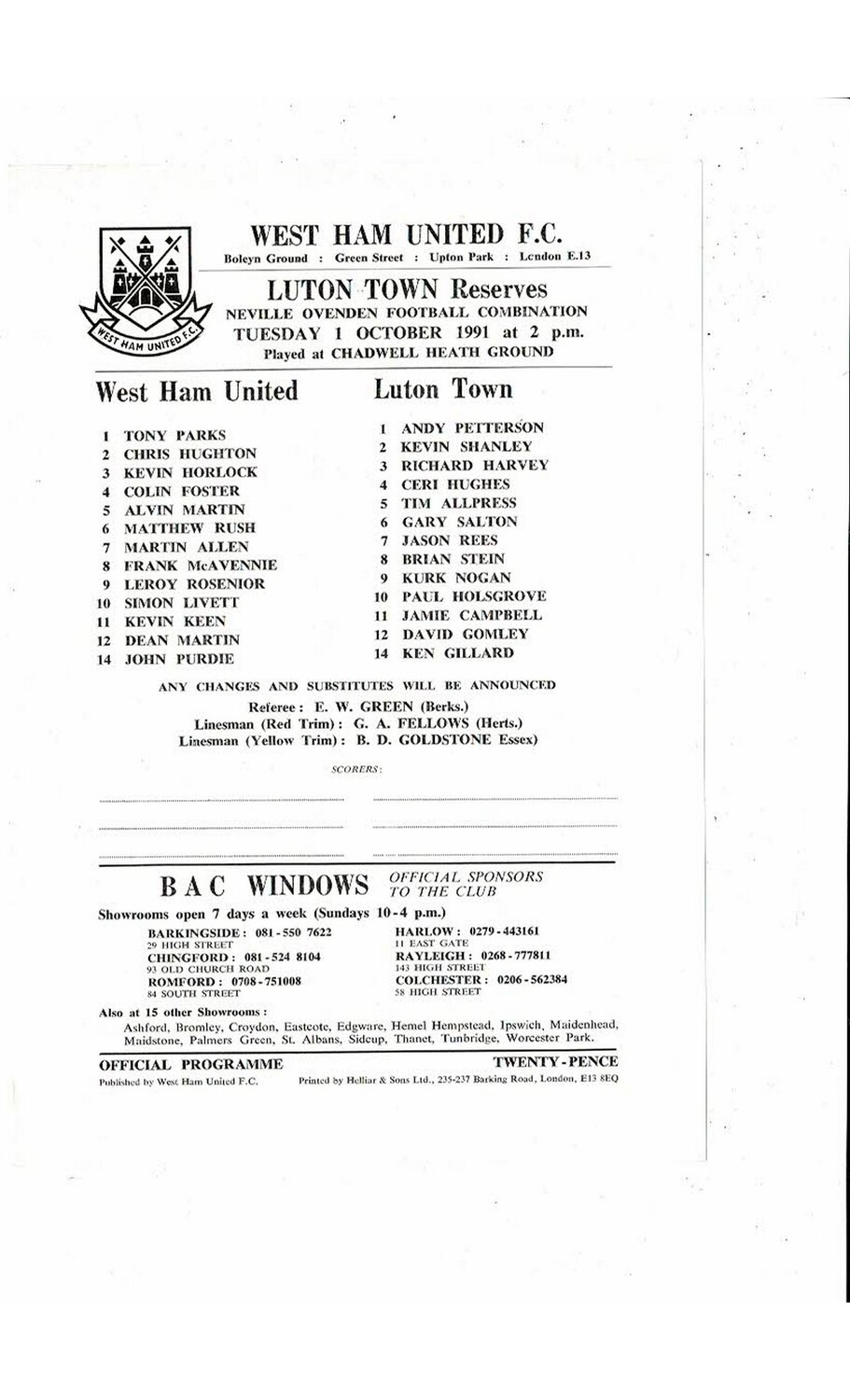 West Ham United v Luton Town Football Combination Programme 1991/92