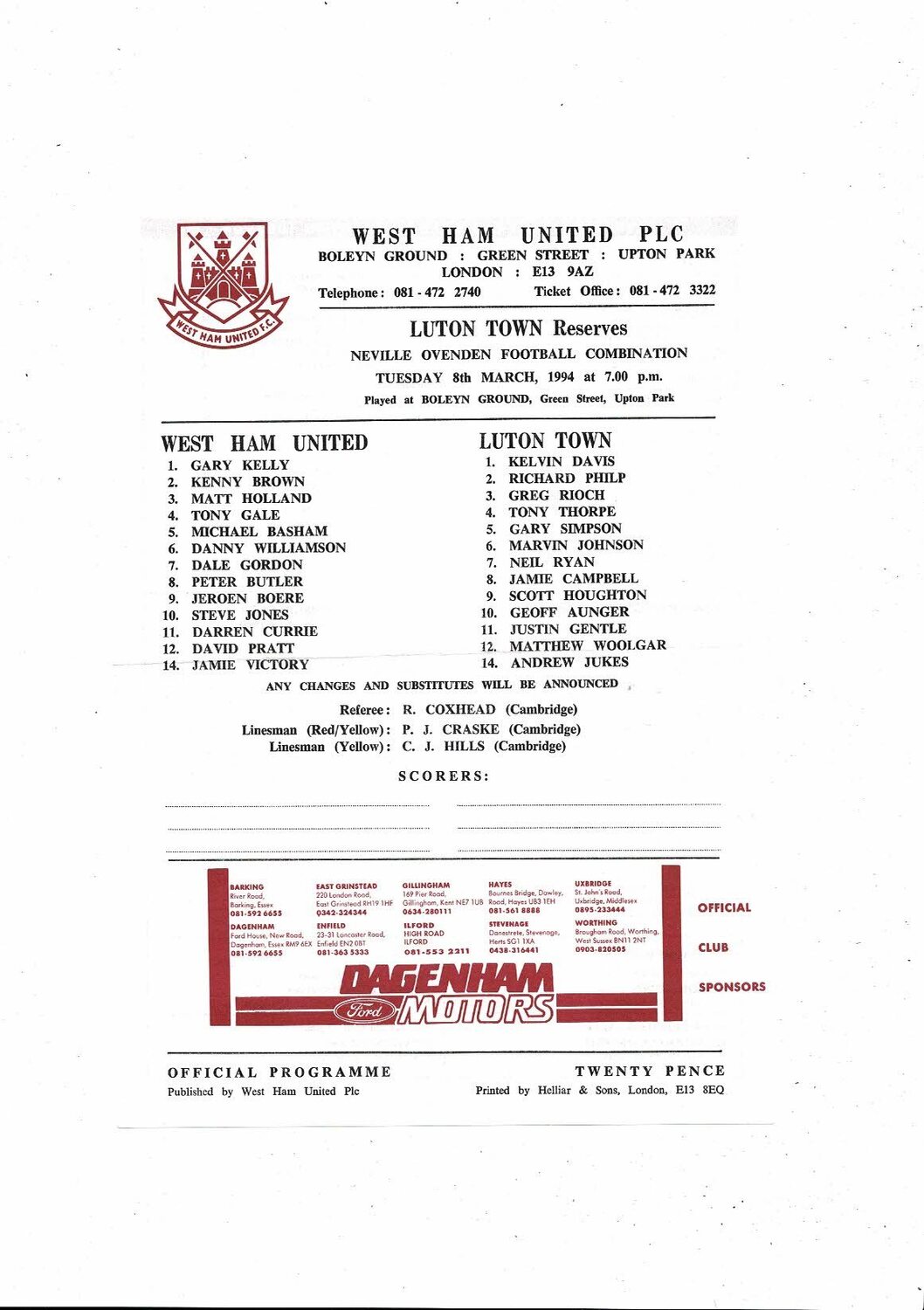 West Ham United v Luton Town Football Combination Programme 1993/94