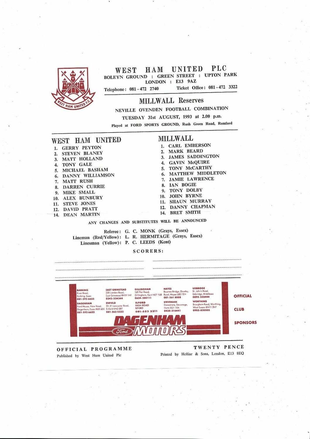 West Ham United v Millwall Football Combination Programme 1993/94