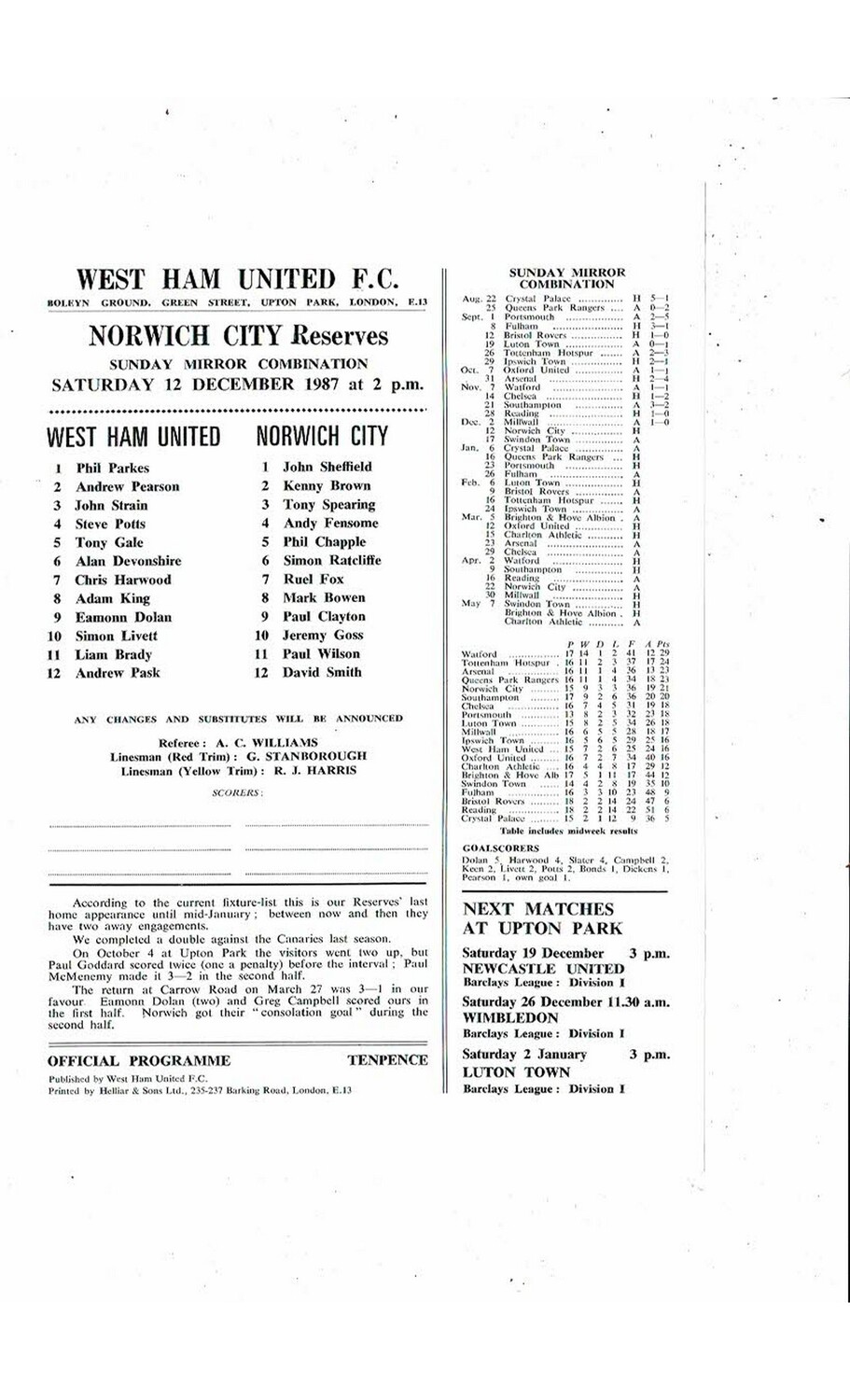 West Ham United v Norwich City Football Combination Programme 1987/88